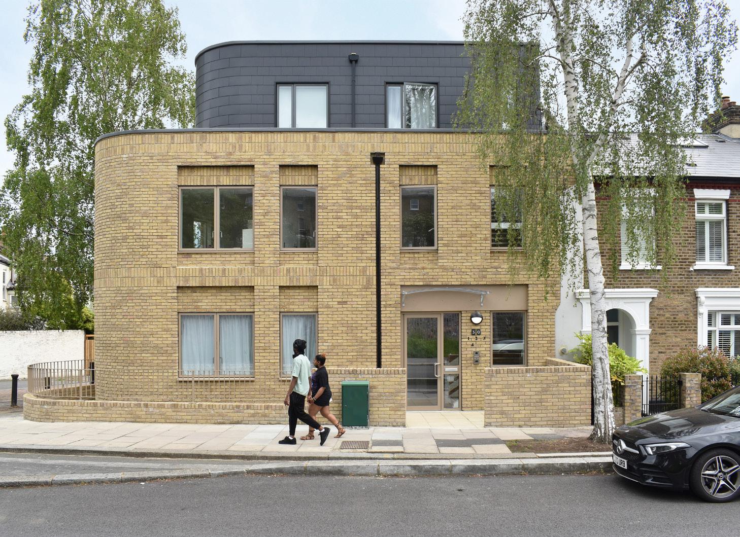 The design references the local context, particularly the adjacent Victorian terraced houses through careful handling of the mass, proportion and articulation of the façade through crisp detailing. The awkward acute corner geometry is dealt with by a softly curved wall. Buff brickwork is used to clad the ground and first floor to reflect the neighbouring terraced cottages, whilst zinc shingles are used for the upper storey to echo the nearby roofs.