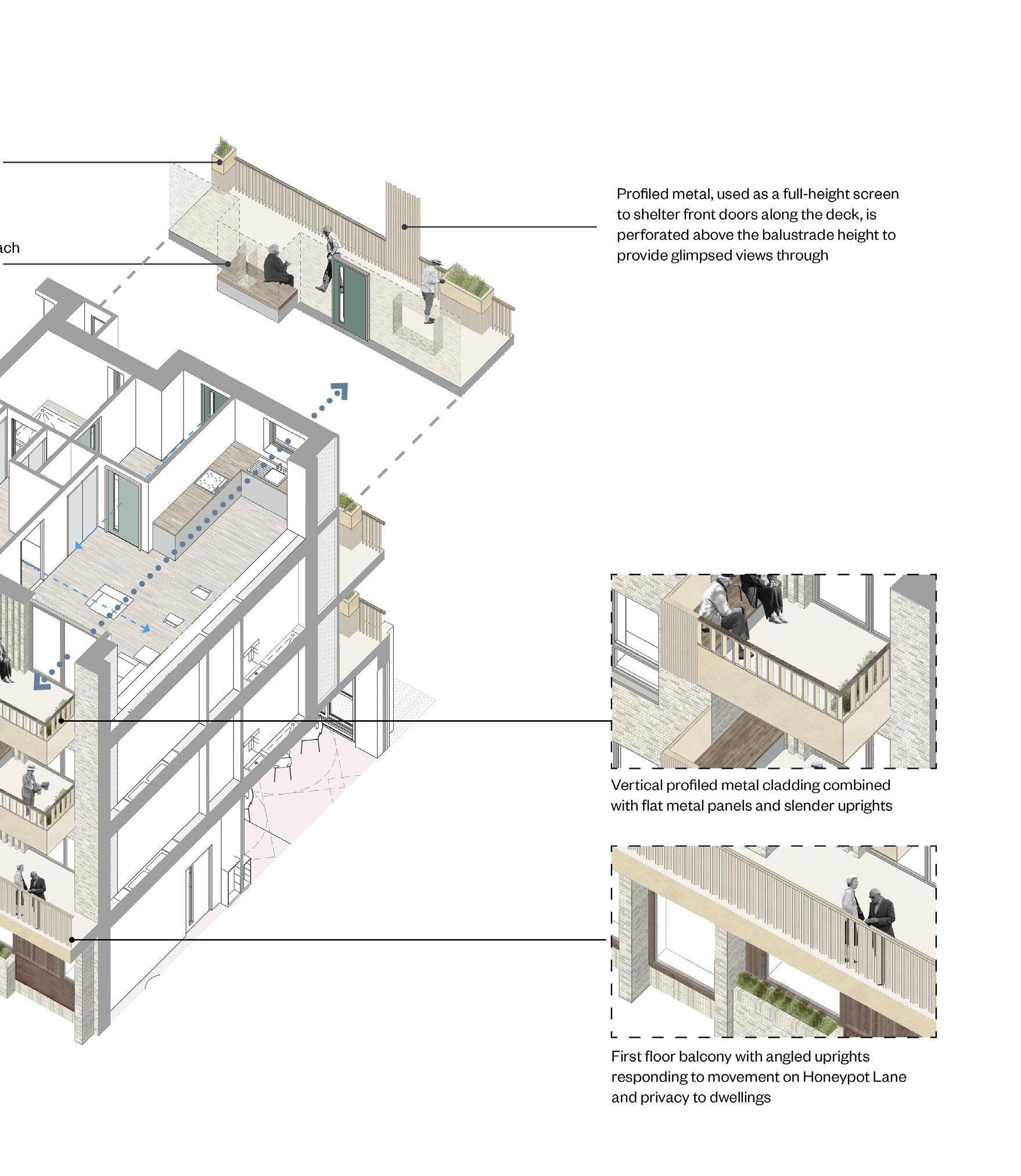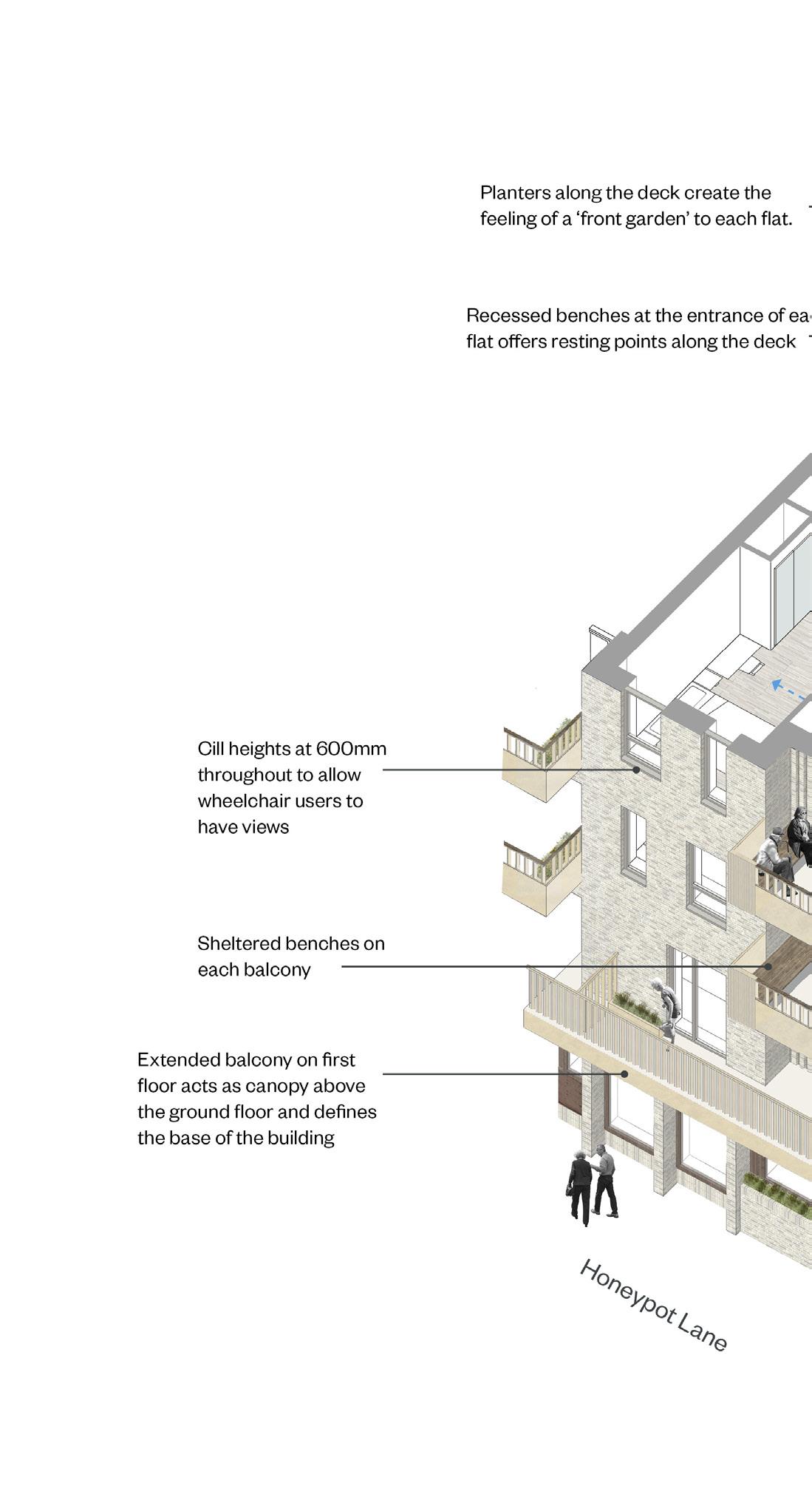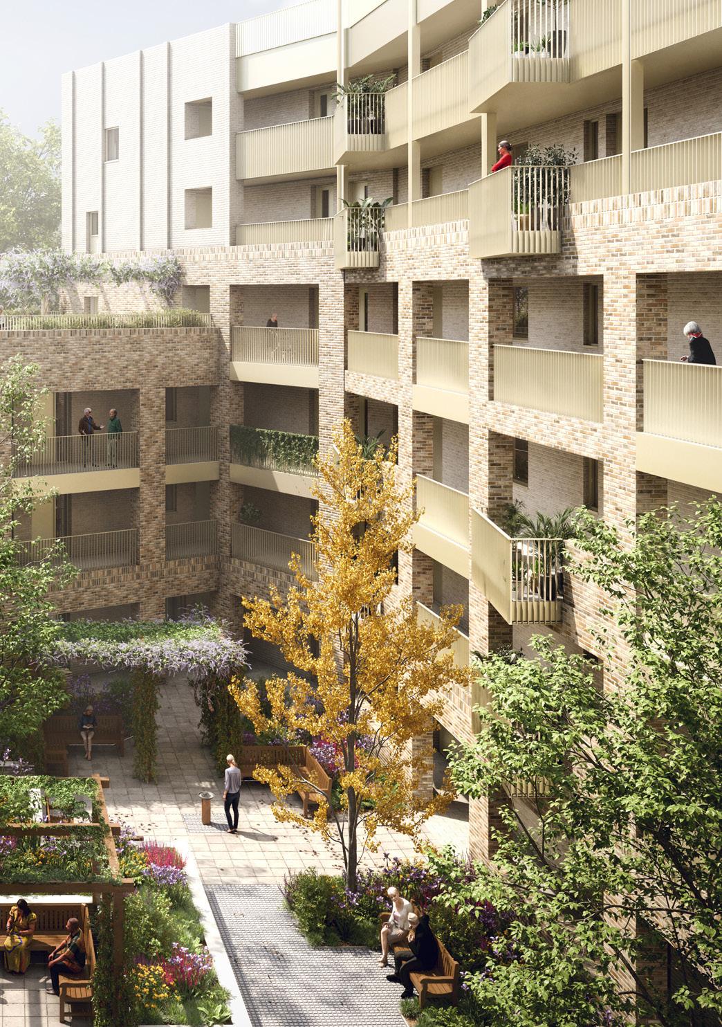 Flats are larger than required by the London Plan in order to incorporate HAPPI design principles, such additional storage space, direct access between the bedroom and bathroom and a flexible layout. This flexibility, along with built-in provision for healthcare technology, will allow residents to stay in their homes for longer, even if mobility or health declines. All flats will have a private balcony or terrace and seating and planters on the open access galleries will create opportunities for socialising with neighbours, fostering a real sense of community. The rear landscaped courtyard will also offer an oasis of calm for residents.