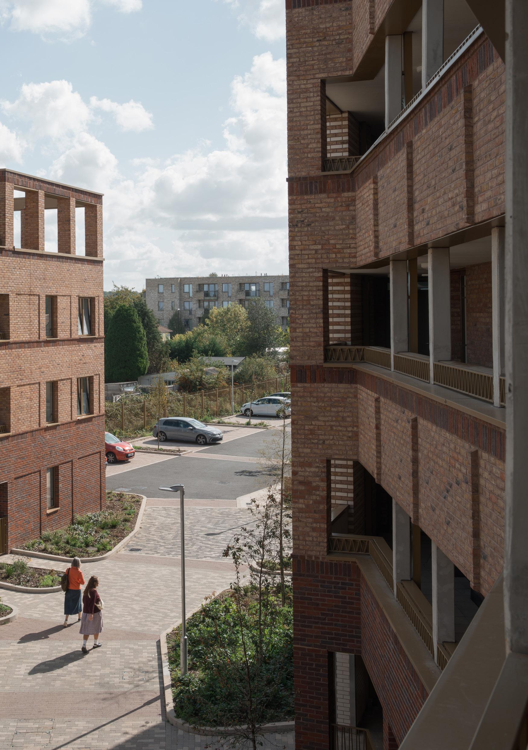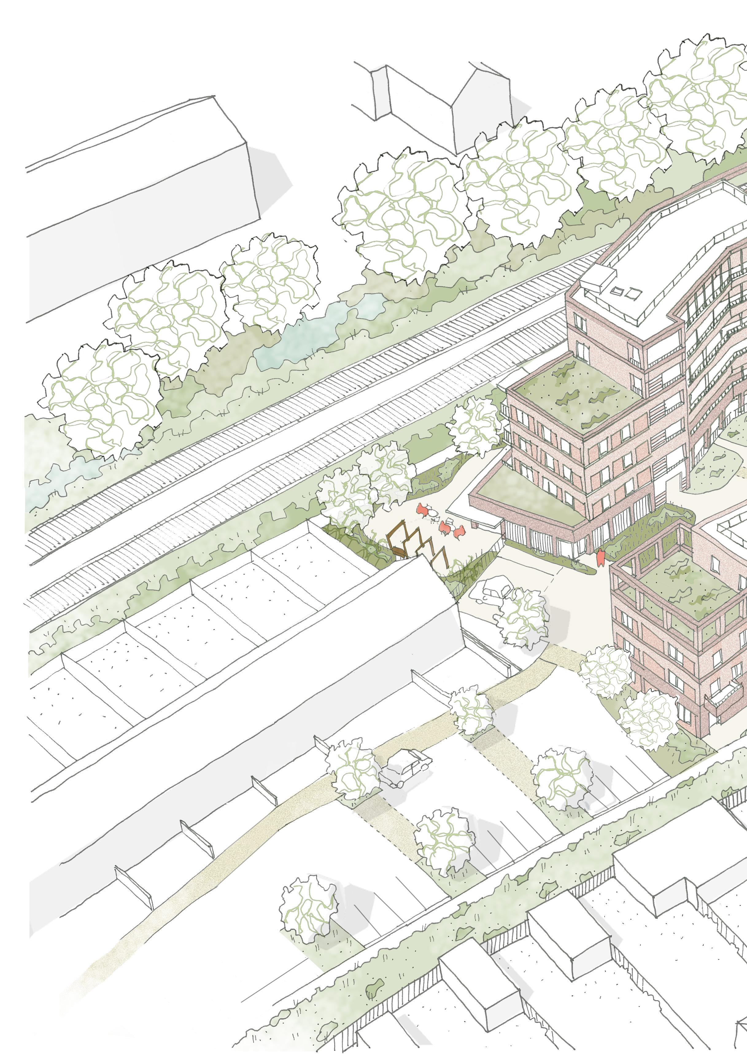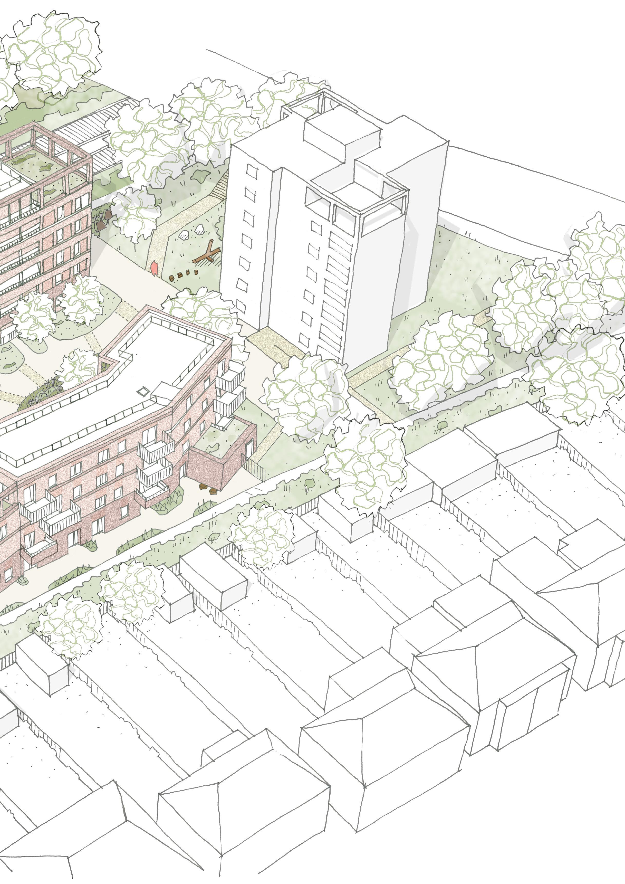 Our design sensitively responds to the geometry and massing of the context, as well as the opportunities offered by the area's topography, to ensure a cohesive overall character is formed between the existing and the proposed buildings and landscape. Improvements will be made to the existing amenity space with a new ball court, landscape design, new parking and estate road resurfacing to link everything together. A protected courtyard will also be created within the new building.