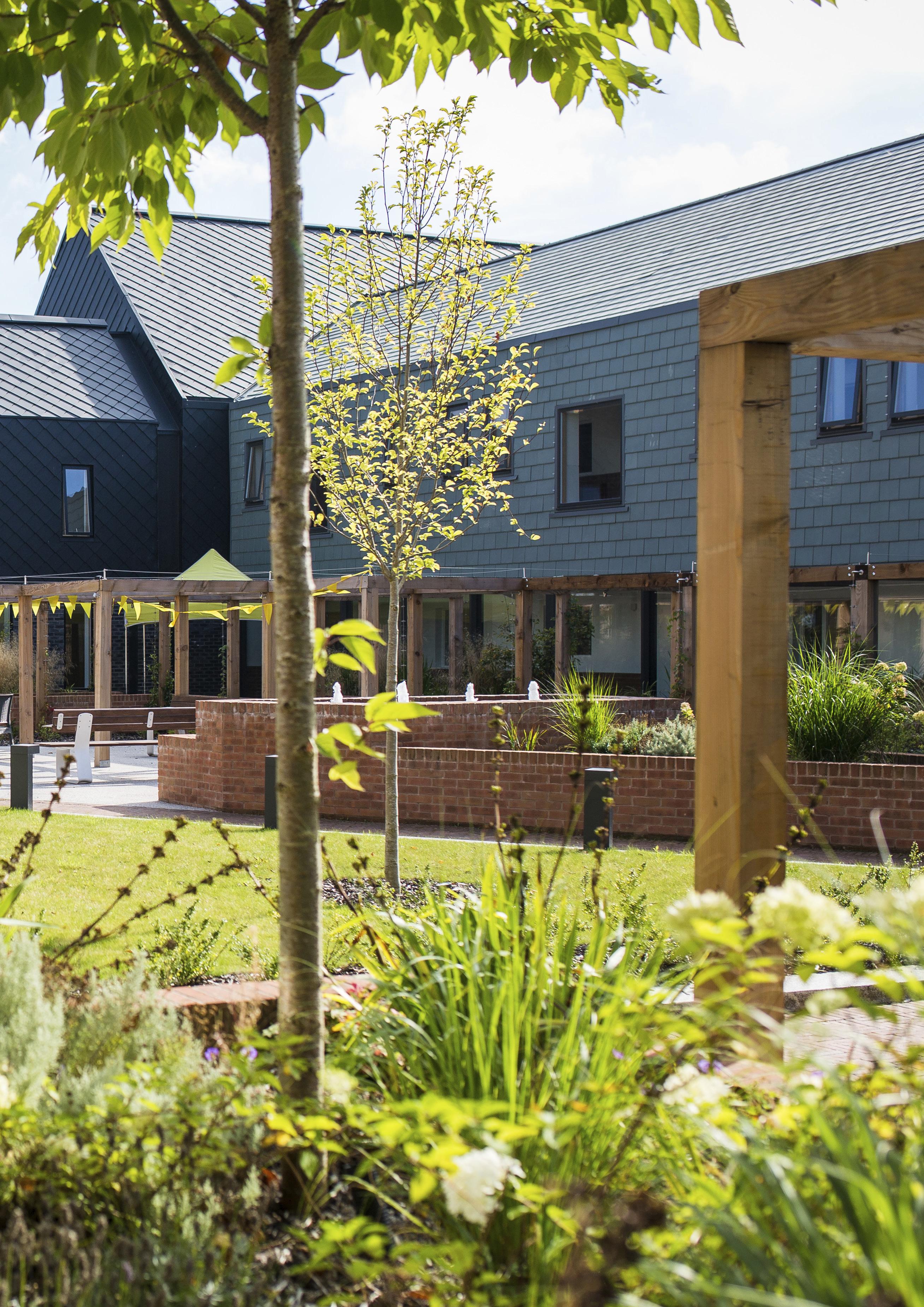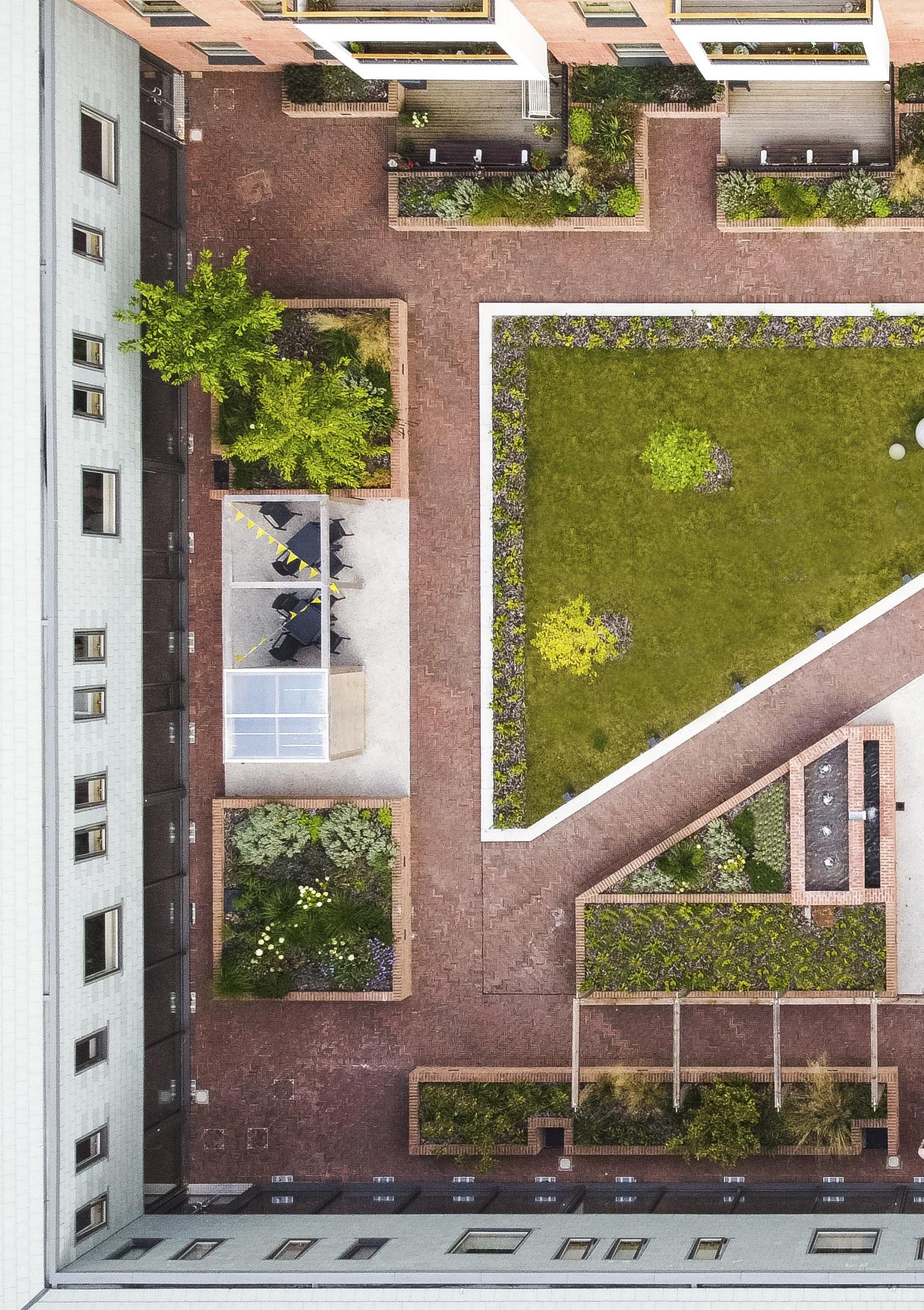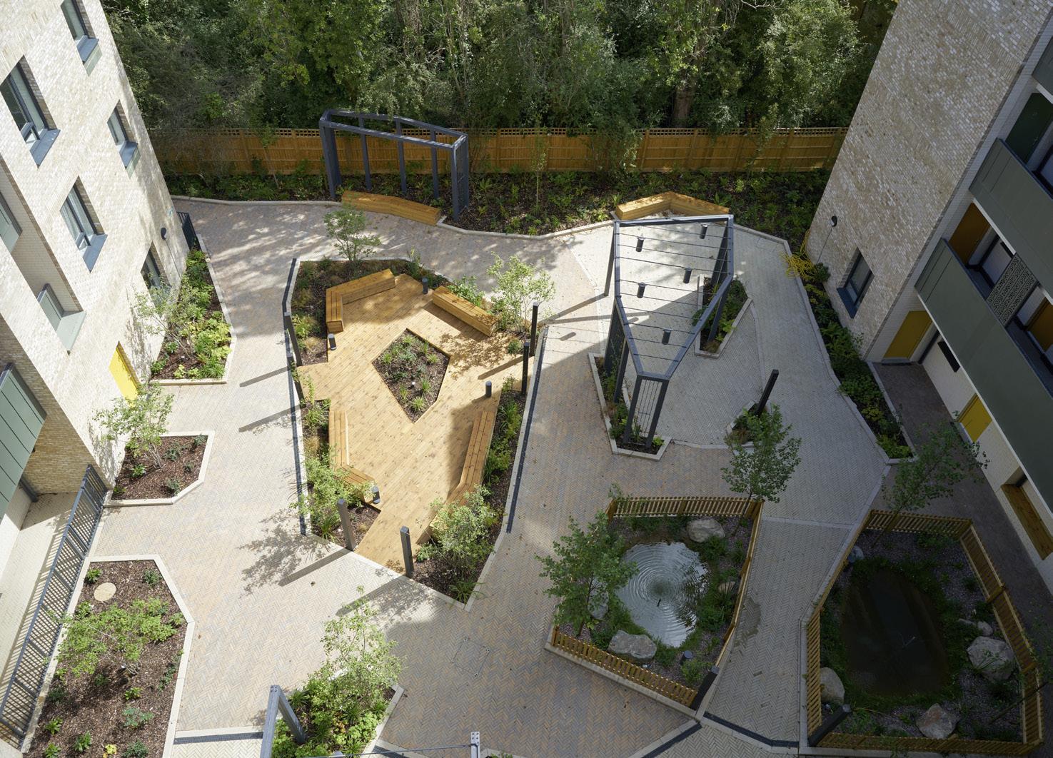 A communal lounge and activity room with green roof sits at the heart of the scheme, with generous views on both sides out into the landscaped areas.