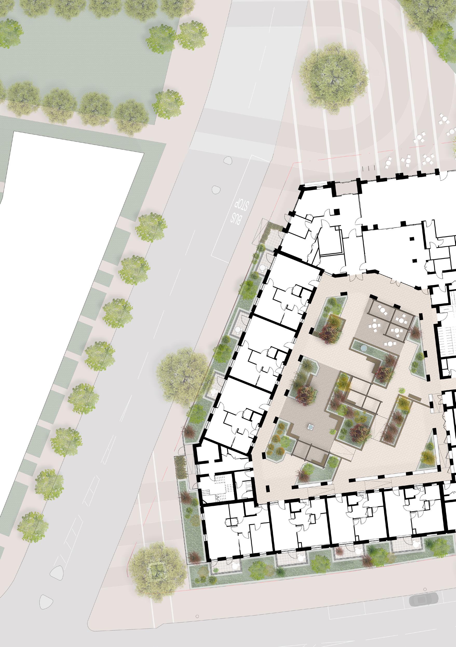 This project develops an underused suburban site to provide 60 new affordable homes for older people with varying care needs. Homes will meet HAPPI recommendations and be fully accessible and wheelchair adaptable, with sliding doors to assist those with mobility issues and large storage areas inside for wheelchairs and scooters. The apartments will blur boundaries between private and communal space to encourage residents to take ownership of shared areas and facilitate interaction. The large central courtyard will be an active focal point and feature raised planting beds to encourage gardening.
