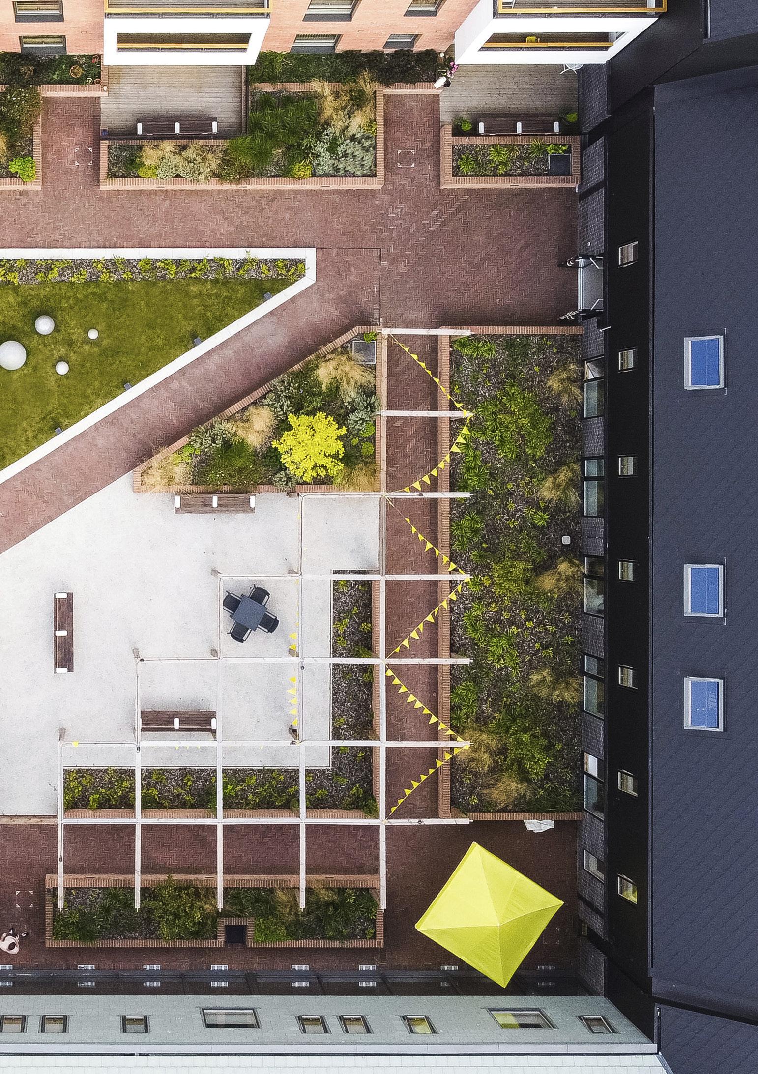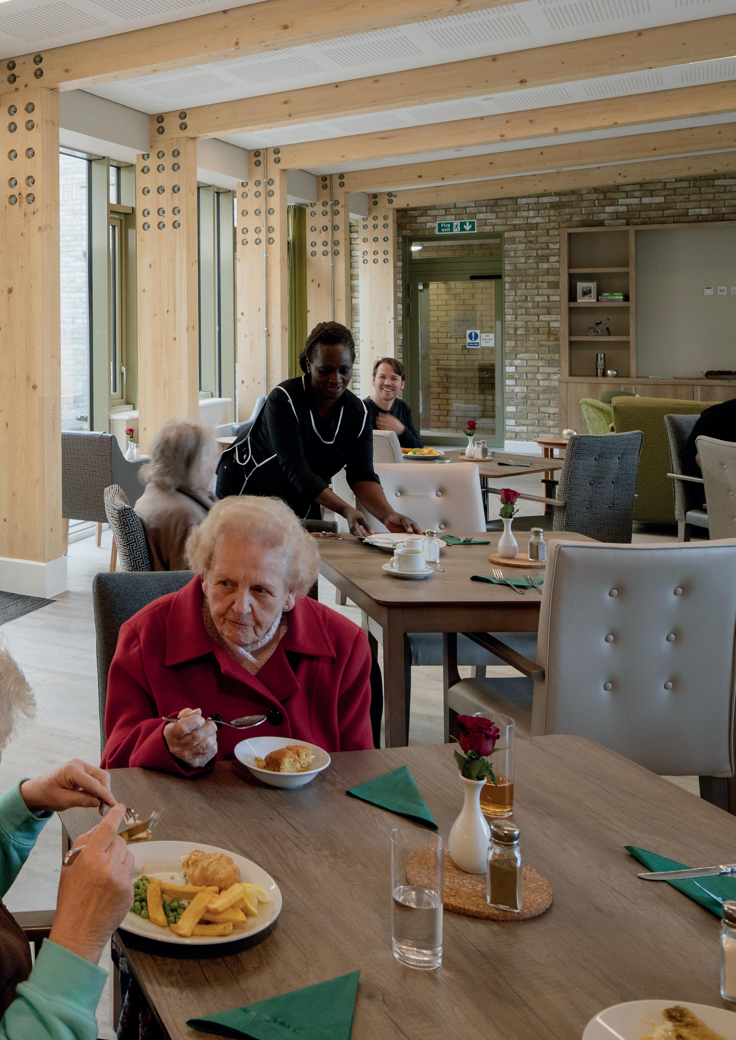 A communal lounge and activity room with green roof sits at the heart of the scheme, with generous views on both sides out into the landscaped areas.