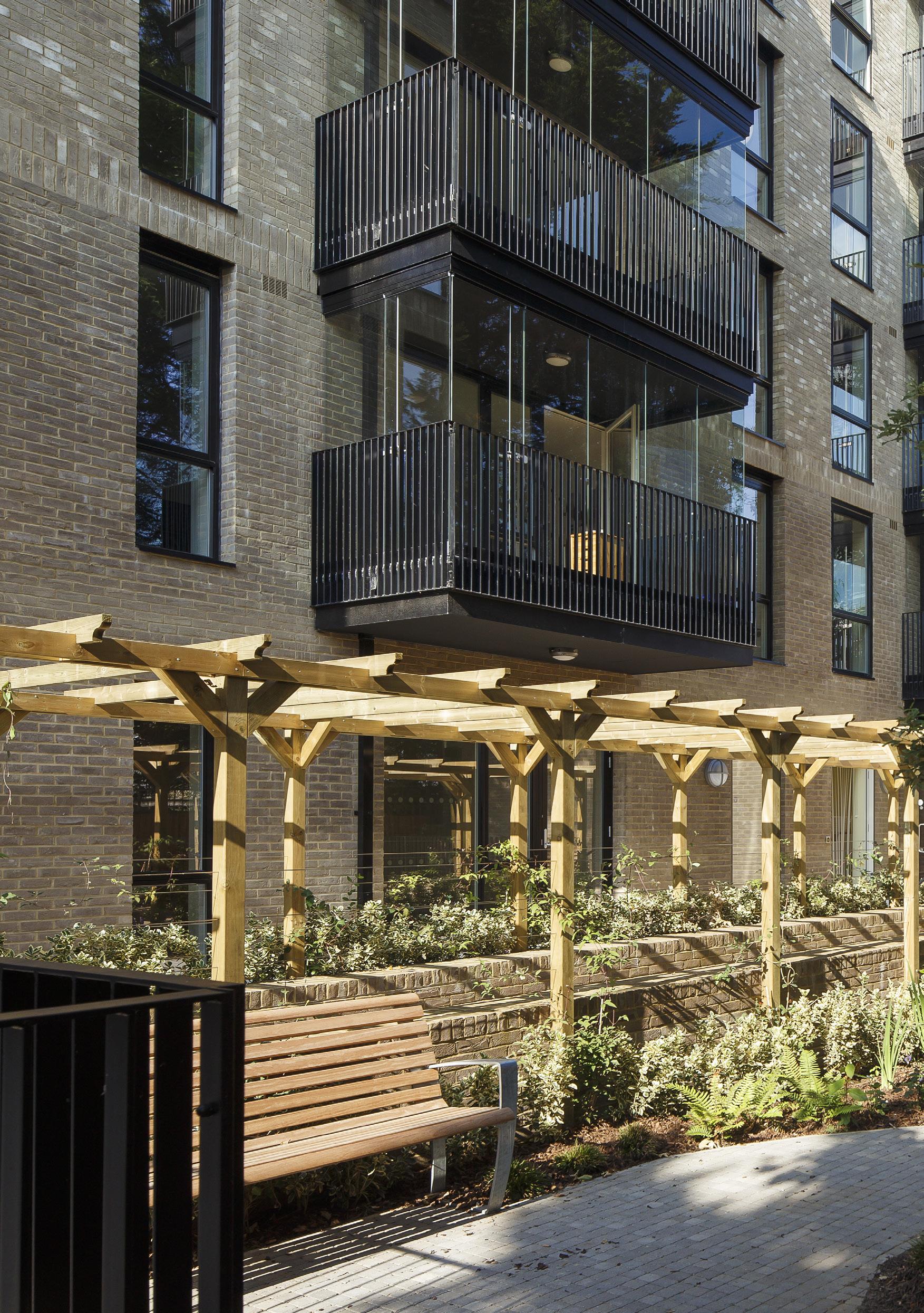 The two subtly cranked buildings partially enclose a pedestrian-prioritised central green space which retains public routes through the site to Beckenham Hill Station. A south-facing ‘garden room’ wraps around into the protected garden for residents and visitors.