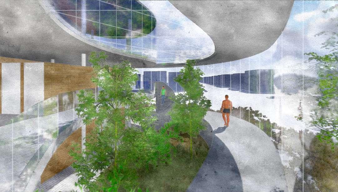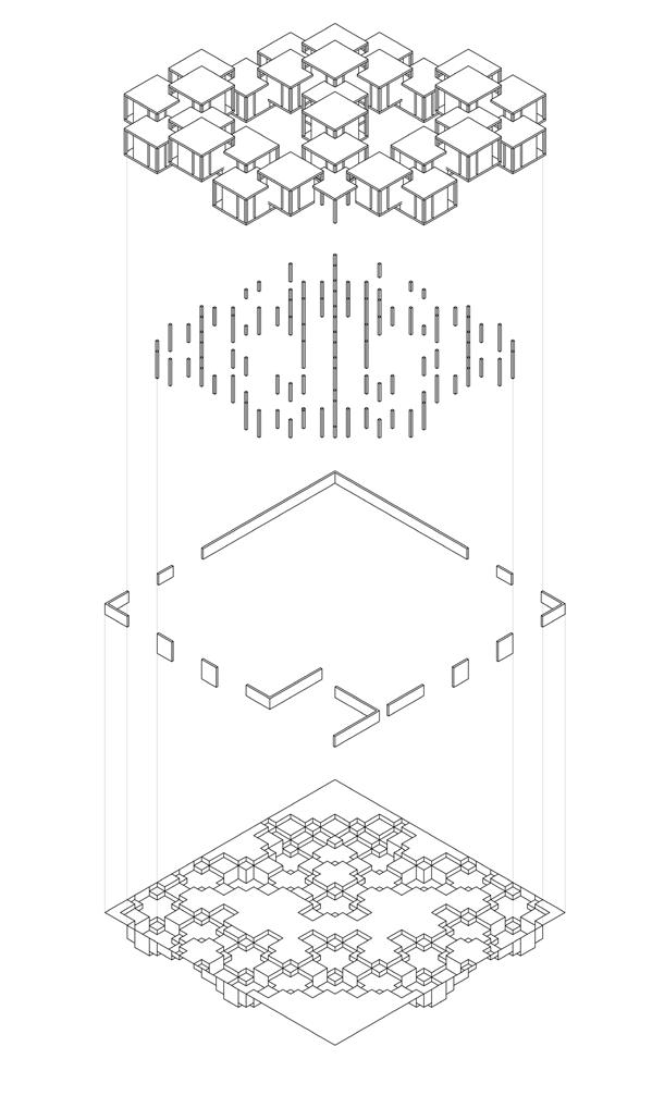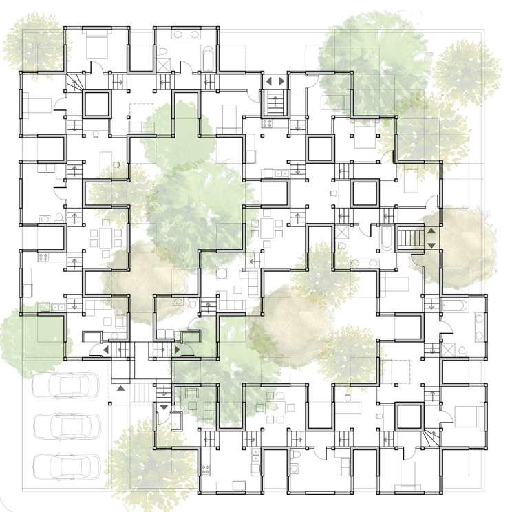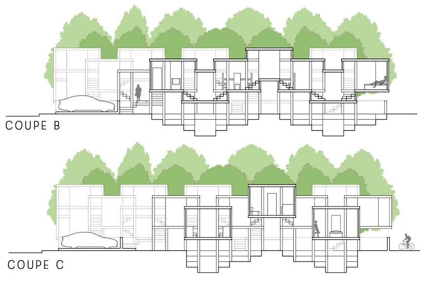 Le bâtiment est constitué de trois habitations conçues en canopée, sur une structure de pilotis, analogue à une forêt de troncs. Il est tourné vers la nature, entouré et entourant les arbres.