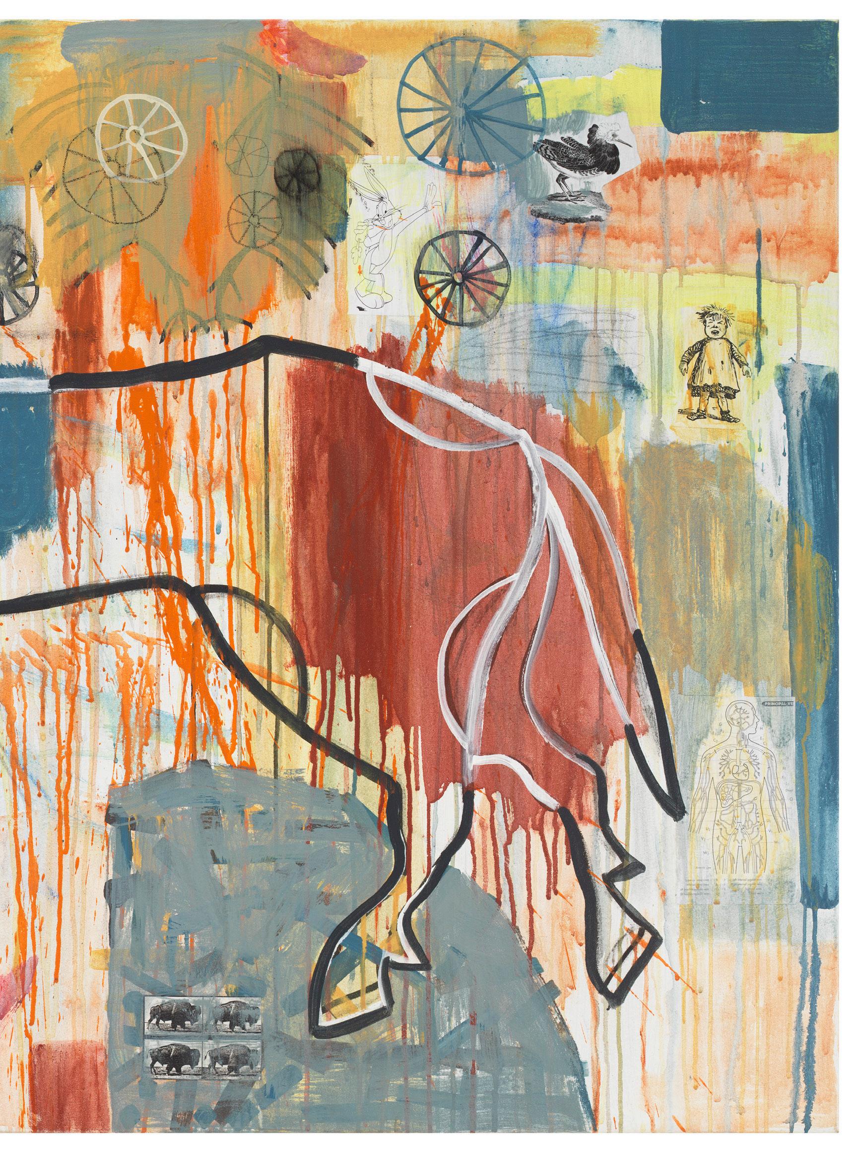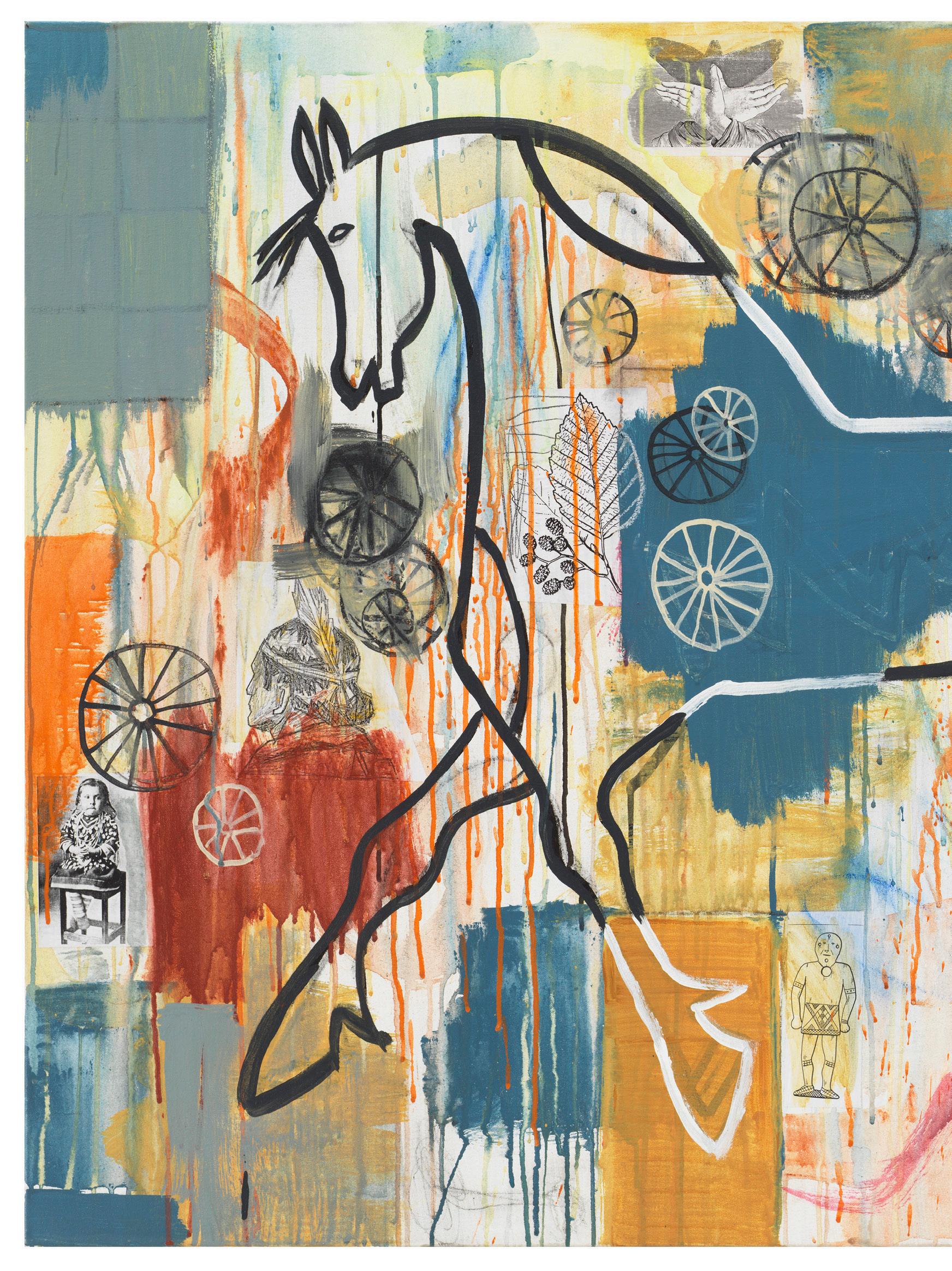 Jaune Quick-to-See Smith, Arlee Ledger Pony 2015, mixed media on canvas, 40" x 60"