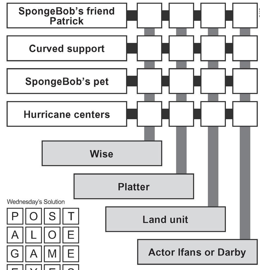 PlayFour! is a puzzle involving eight clues, four across and four down. The four-letter answers can be names, abbreviations, acronyms, even prefixes. Answers can be more than one word.
