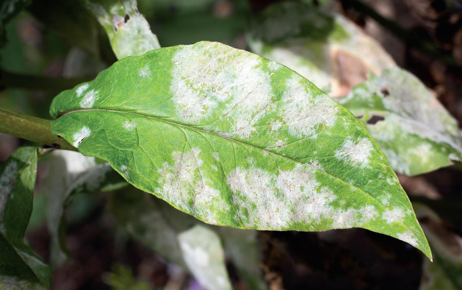 This fungal disease resembles a dusting of white powder on leaves, stems and fruit. It thrives in warm, humid weather and often appears on vegetables like cucumbers, squash, tomatoes and peas. You can help prevent it by giving your plants enough space for air to circulate. Choosing resistant varieties and watering at the base of your plants can also help.