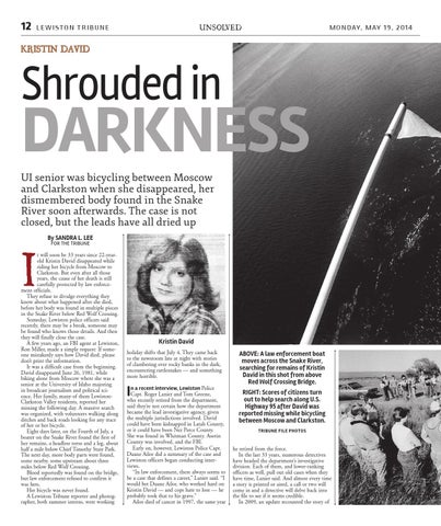 t will soon be 33 years since 22-yearold Kristin David disappeared while riding her bicycle from Moscow to Clarkston. But even after all those years, the cause of her death is still carefully protected by law enforcement officials. They refuse to divulge everything they know about what happened after she died, before her body was found in multiple pieces in the Snake River below Red Wolf Crossing. Someday, Lewiston police officers said recently, there may be a break, someone may be found who knows those details. And then they will finally close the case. A few years ago, an FBI agent at Lewiston, Ron Miller, made a simple request: If someone mistakenly says how David died, please don’t print the information. It was a difficult case from the beginning. David disappeared June 26, 1981, while biking alone from Moscow where she was a senior at the University of Idaho majoring in broadcast journalism and political science. Her family, many of them LewistonClarkston Valley residents, reported her missing the following day. A massive search was organized, with volunteers walking along ditches and back roads looking for any trace of her or her bicycle. Eight days later, on the Fourth of July, a boater on the Snake River found the first of her remains, a headless torso and a leg, about half a mile below Chief Timothy State Park. The next day, more body parts were found, some nearby, some upstream about three miles below Red Wolf Crossing. Blood reportedly was found on the bridge, but law enforcement refused to confirm it was hers. Her bicycle was never found. A Lewiston Tribune reporter and photographer, both summer interns, were working