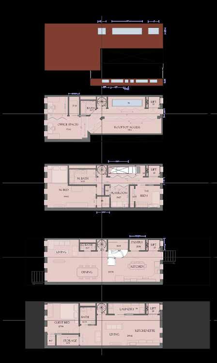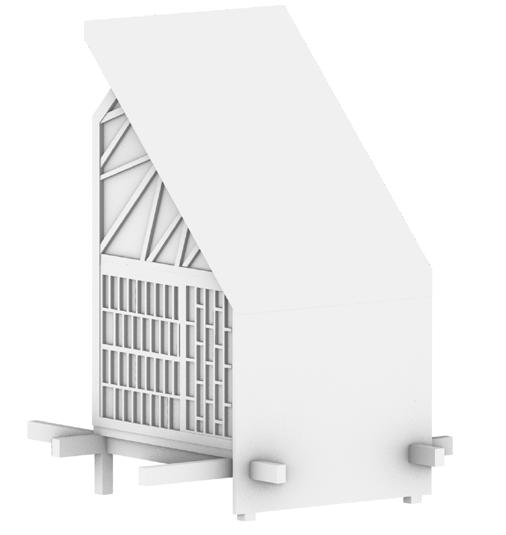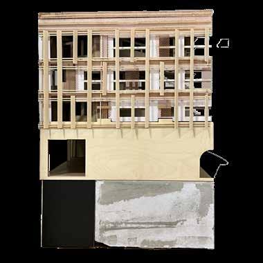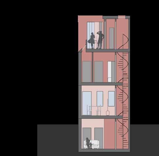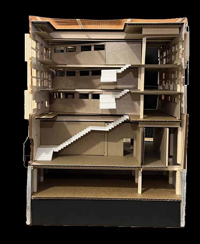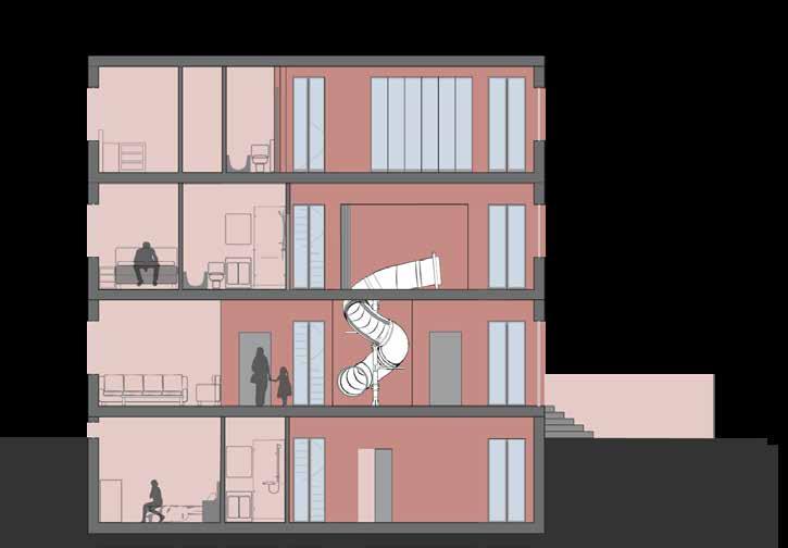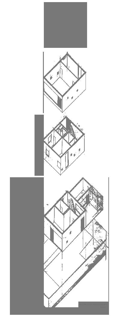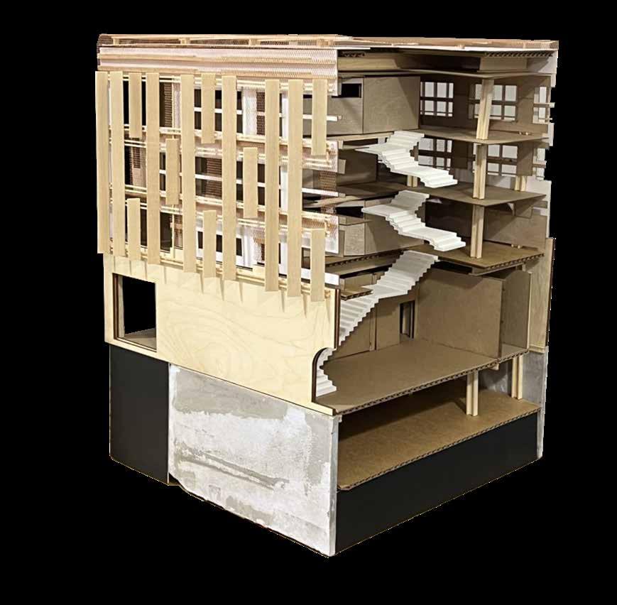 The goal of this 8 week partner project was to adapt a building on two adjoining lots to accomodate a residential and commercial mixed-use space. Thimble House is the combination of a thrift store, upcycling studio, and affordable housing, located on Baltimore and Springfield Avenue in West Philadelphia. In addition to the pre-existing brick shell facade, this project demonstrates its sustainable design with the multi-layered exterior skin. Similar to the function of a THIMBLE, this integrated skin provides the user with protection against harsh external conditions, whilst also giving them the control of these conditions. The perforated skin acts as a sunscreen to allow diffused light, operable awning windows can be opened to introduce ventilation, and a series of louvers shade from western sunlight.