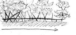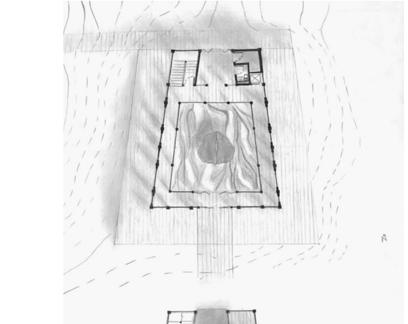 These two meditation spaces are designed to contrast eachother. Meditation B is heated by fire with a maze-like entry and rough materiality, whereas, building C is set over a cool pond utilizes smooth concrete panels on the interior.
