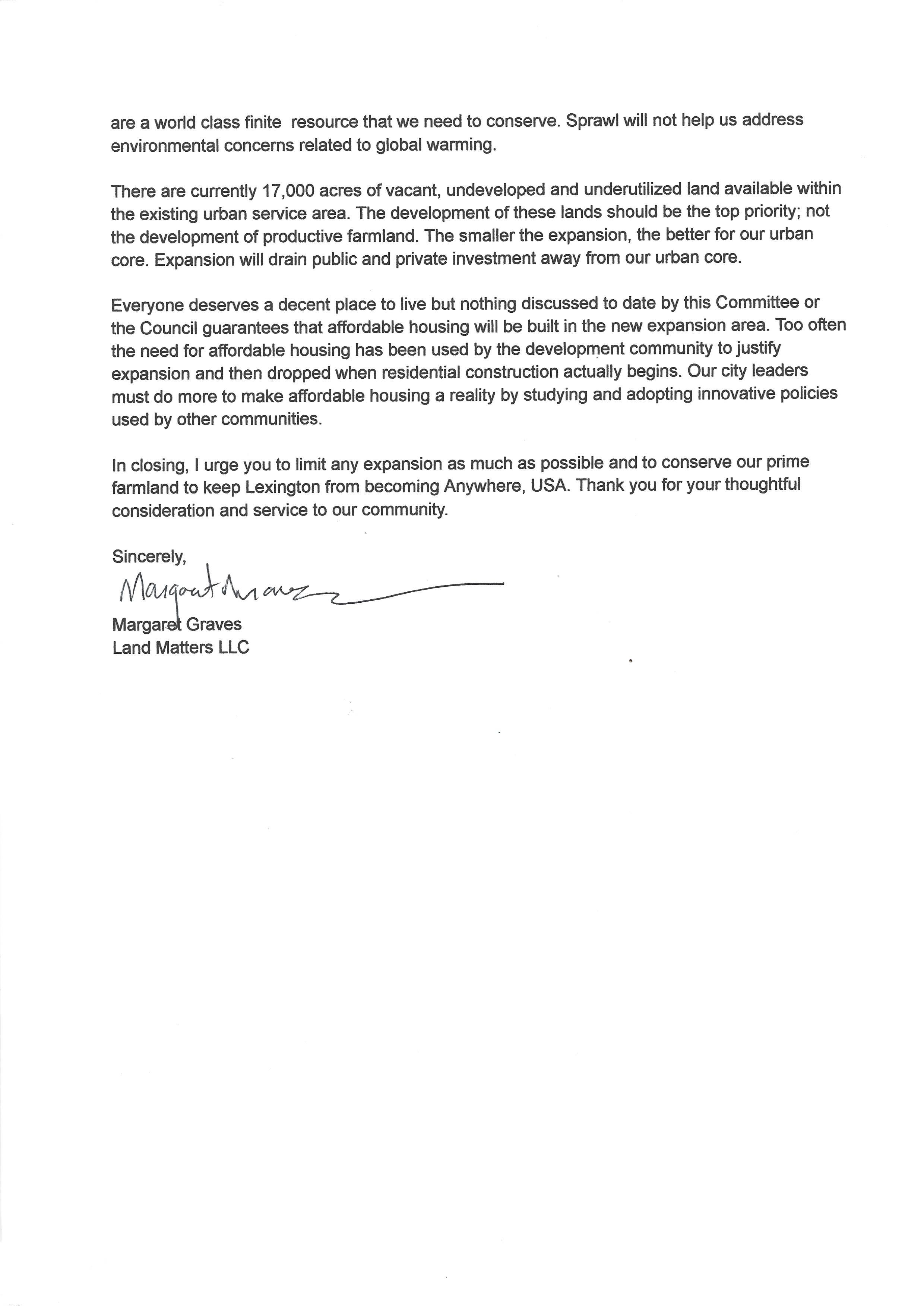 As outlined on page 35 of the 2017 Rural Land Management Plan, Hisle Park, “when fully developed, will provide the public with access to rural greenspace and an opportunity to connect with nature and Fayette County’s farm heritage”. It is important to make sure the UGMAC is aware that the land was donated to the LFUCG because of Mr. and Mrs. Hisle’s desire to preserve the character of the land and afford the opportunity for the public to enjoy the scenic beauty in perpetuity. To open the opportunity for development around the park is to open the potential to change the “character of the land” and “scenic beauty” of the area.