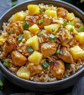 Preheat the oven to 400°F. Place chicken, pineap ple, peppers, and potatoes onto a prepared baking sheet. Drizzle with sesame oil and canola oil and then sprinkle with sugar and season with salt and pepper. Toss to coat all ingredients. Bake for 15 minutes, stir, and return to the oven for an addi tional 10 minutes or until lightly browned and chicken is cooked through. Sprinkle with coconut and drizzle with lime juice just before serving.