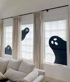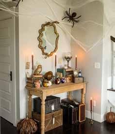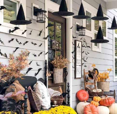 The porch is often the first thing trickor-treaters see, making it the perfect spot to show off homemade decorations. Stack hay bales or crates as a base, then add pumpkins, cornstalks, and lanterns for a welcoming yet eerie scene. Old sheets can be draped over chairs to create ghostly figures that sway in the wind. If you enjoy DIY projects, paint old tin cans with monster faces, poke holes in the sides, and place a candle or LED light inside for a homemade lantern effect.