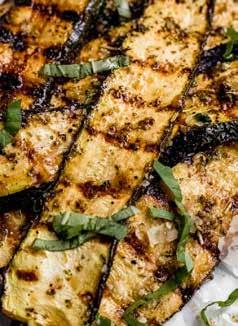 and reserve the balsamic mixture. Grill the zucchini until charred on one side, about 10 minutes. Flip the zucchini and grill the other side for about 3-4 minutes, until the zucchini is cooked but not falling apart. Transfer the zucchini to a platter, drizzle with the remaining balsamic mixture, and sprinkle with Parmesan cheese and fresh basil.