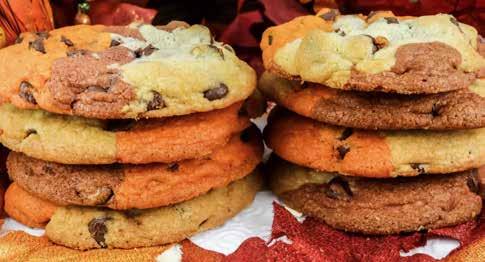 Preheat the oven to 375°F. Cream the butter, brown sugar, and granulated sugar. Add the eggs and vanilla, and mix until fluffy. Add the baking soda and salt and mix, then gradually add the flour and mix until it is completely incorporated. Separate the cookie dough into three equal portions. Use food coloring to color one portion orange and one portion brown. Add chocolate chips to each portion. Create a 2 oz. cookie dough ball out of orange, brown, and white dough. Slightly press the cookie ball onto the prepared cookie sheet and bake for 8-10 minutes or until golden brown around the edges.