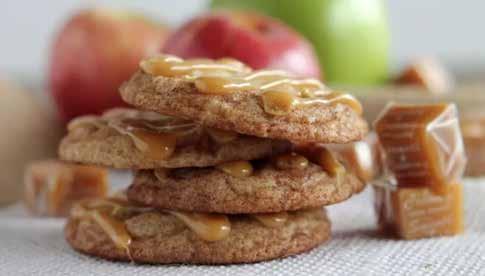 Preheat the oven to 350°F. Cream the butter with ¾ cup of sugar, add egg and vanilla, and mix until well incorporated. In a separate bowl, combine the flour, cream of tartar, salt, and baking soda. Add dry ingredients to the wet mixture and mix until combined, then fold in the diced apple. In a small bowl, combine ¼ cup sugar and 1½ tsp cinnamon. Scoop cookie dough balls, roll them into the cinnamon sugar mixture, and place them on a prepared baking sheet. Bake for 10-12 minutes or until brown on the edges and allow to cool. Heat caramel squares in the microwave for short bursts of 15 seconds at a time until just melted. Place in a zip-top bag and cut off the corner. Pipe a zigzag of caramel over the tops of the cookies and allow to set.