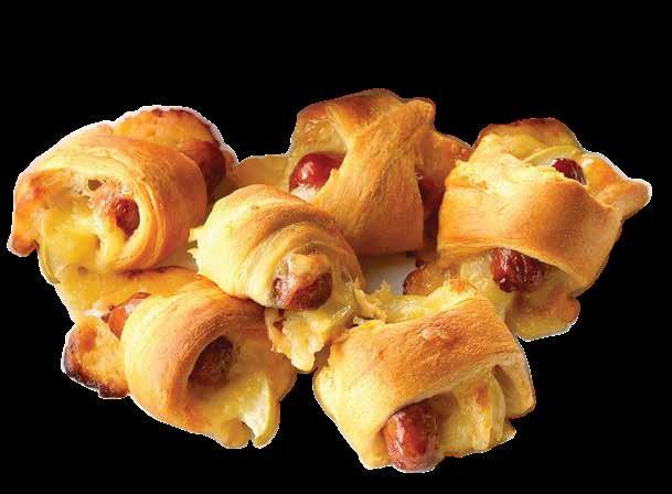 Preheat the oven to 375°F. Unroll the crescent dough and separate it into triangles. On the wide end of each triangle place one slice of apple, one folded piece of cheese, and one sausage; roll up tightly. Place one inch apart on parchment-lined baking sheets, point side down. Bake until golden brown, 10-12 minutes, and serve with dressing.