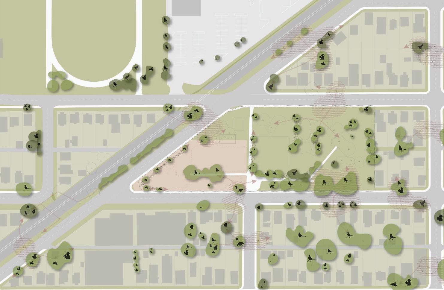 Beginning by analyzing the site, I looked at the existing biophilia in the area, specifically the animals and the vegetation. Animal movement was studied as well as vegetation patterns and what already existed on the site. The idea was to add more vegetation to the surrounding areas to encourage animals movement to and from the site, safely across the busy roads.
