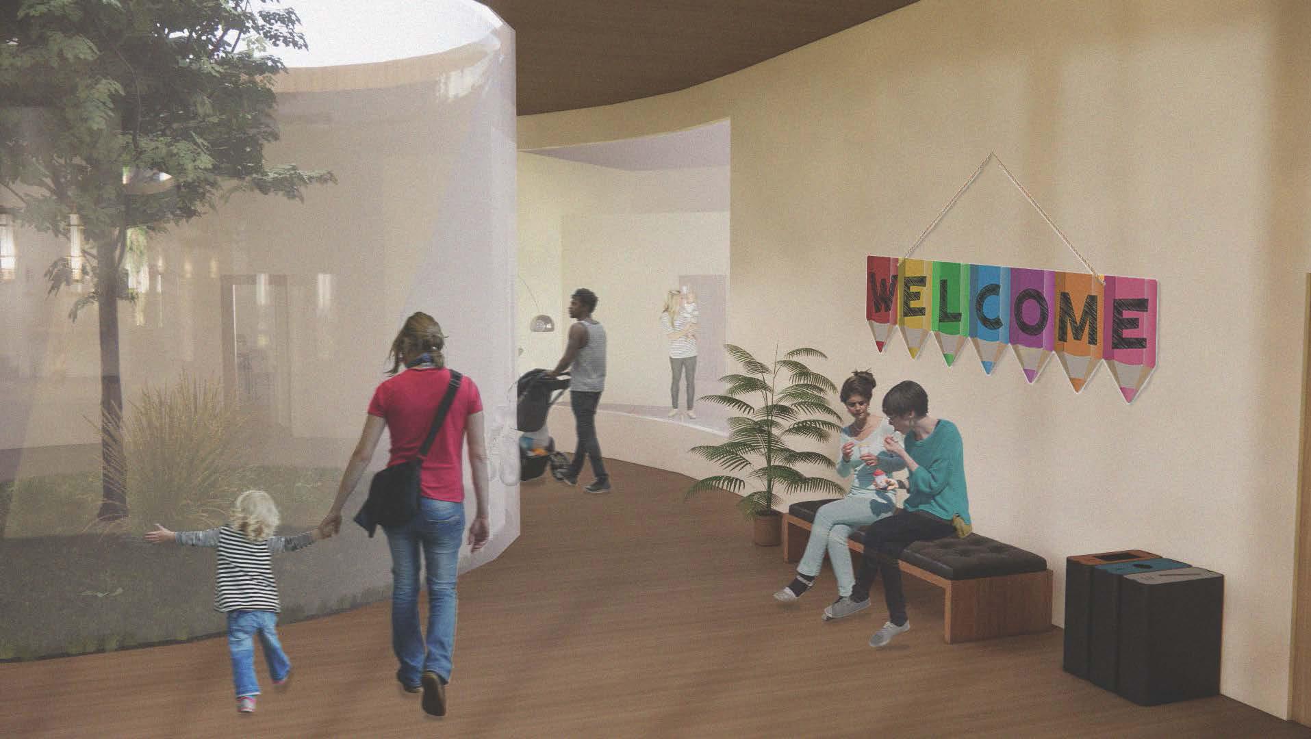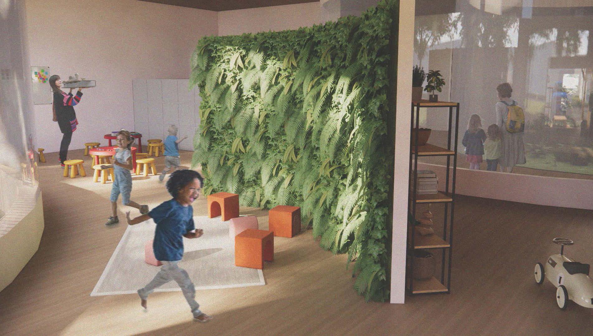 Two “Eco Pockets” are placed throughout the building which is the main component to blurring the lines between interior and exterior. The Eco Pockets are circular glass spaces that are directly open to the outdoors above. One Eco Pocket houses small shrubs and mosses due to the limited sunlight it can get This Eco Pocket also has rain water collection basins to reuse and water all the vegetation in the building. The second Eco Pocket houses a small tree since it gets the most sunlight in the building. This Eco Pocket can be viewed from the first floor or from the toddler and preschool playspace on the roof of the first floor. To further encourage a connection to nature, each child suite (infant, toddler, and preschool) has a living green wall that progresses in size and growth as the children move from one suite to the next.