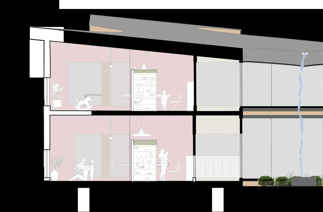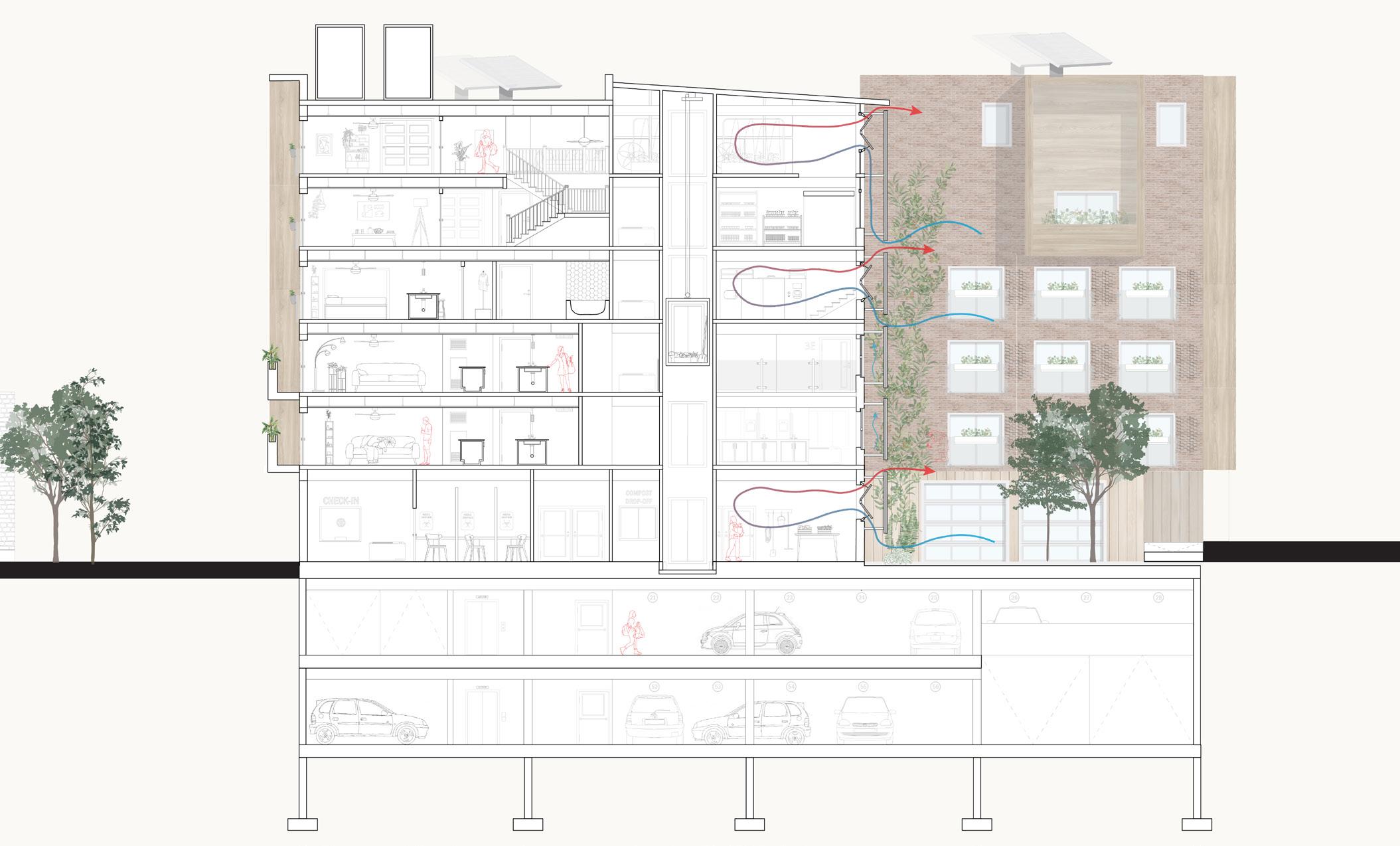 The 2nd floor of the Growhouse is where the residential units begin. This floor also features a community kitchen. The community kitchen is a place for residents to go to learn from one another, and where they can be supported in a communal setting. The kitchen has hydroponic gardens that provide fresh herbs using nutrients rich water and artificial lighting. Aside from the hydroponic gardens in the kitchen, there is also one in every unit, supporting the growth of the residents and the growth of the vegetation.