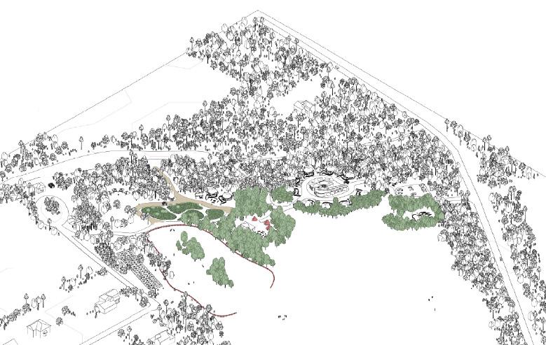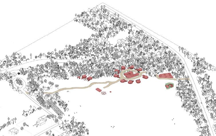 Vegetation starts to get added to break up the large site as well as more ceremony spaces, more pathways, horse fencing for the horses that live on the property, multiple river interventions and a variety of gardens.