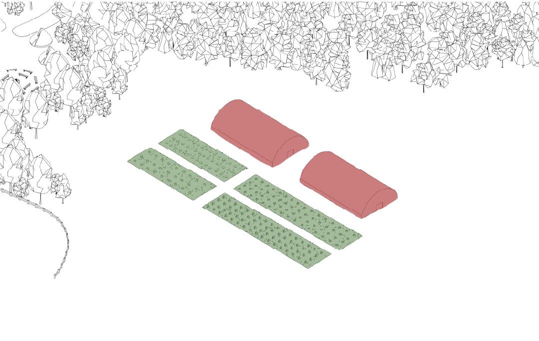The beginning phase includes removing a few necessary trees for access points, accommedations and pathways. Semi-permanent tents will also be added for the students to live in while the site is established.
