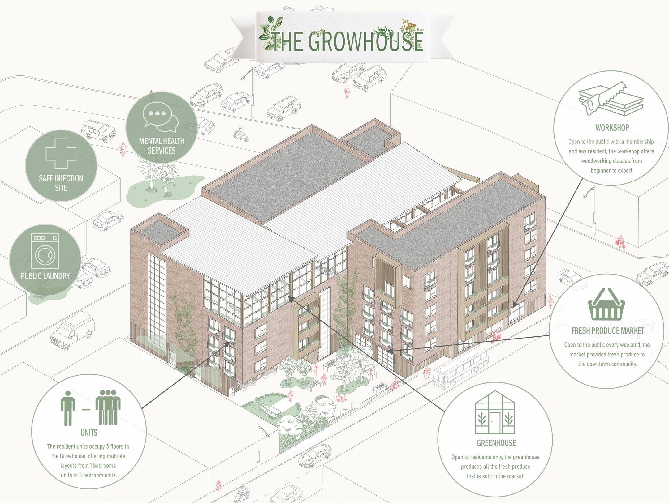 The Growhouse is a multi-use residential building that houses transitional housing residents. The concept for Growhouse is Growth. Growth is represented in two ways, the personal growth in the residents, as well as the physical growth of the vegetation in the building. The Circle of Growth is how both of these grow types weave together and create a community within the building.
