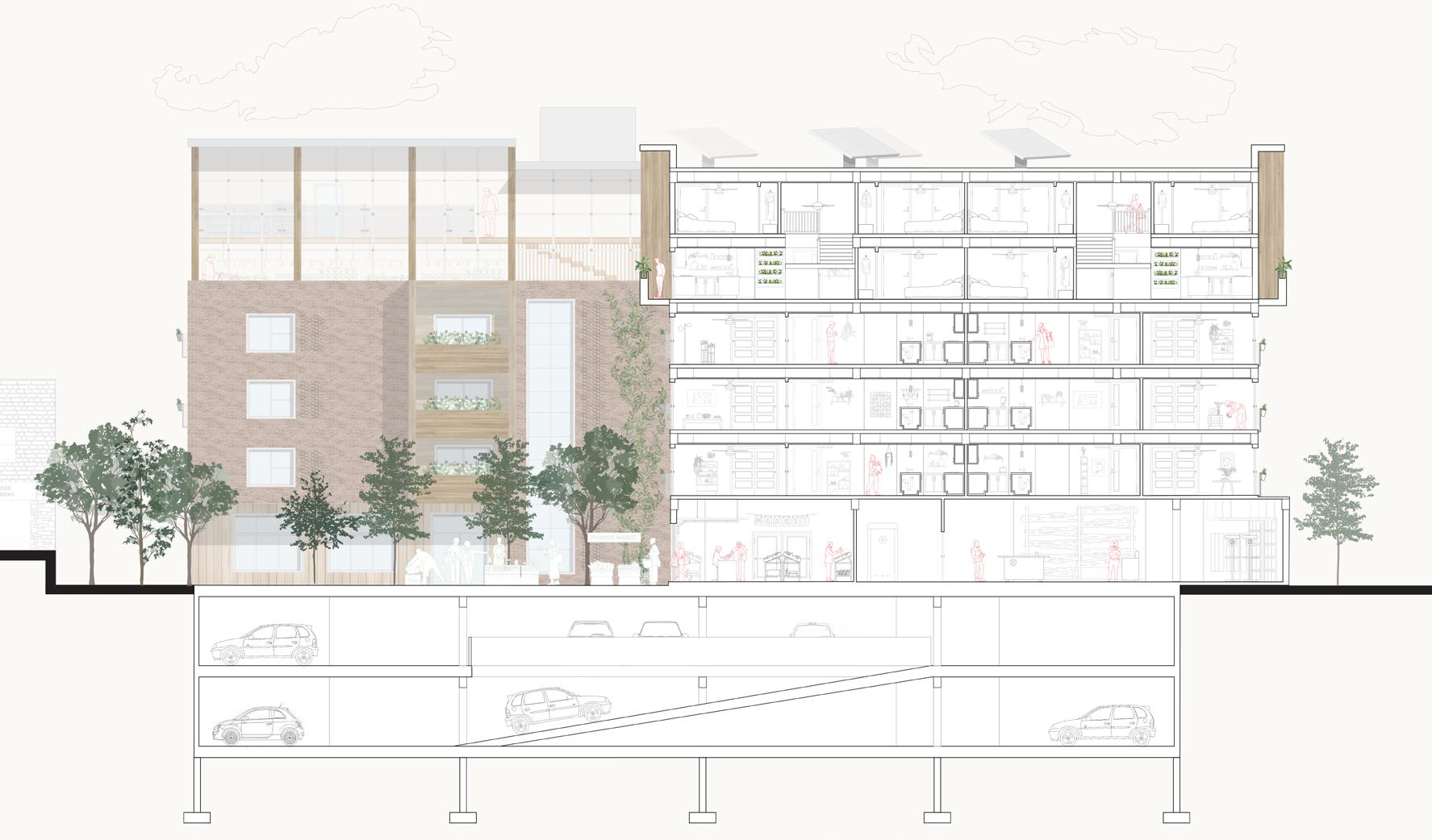 The ground floor of the Growhouse features a fresh produce market that sells the produce grown in the growhouse on the 5th floor, as well as collects the compost from the community. Also featured is a workshop where residents can go for free or community members can go for a monthly fee. Here people can take lessons on how to construct basic everyday things out of wood, pottery, or other materials. These two spaces support the residents by providing everyday jobs as an opportunity to slowly transition to full time employment.