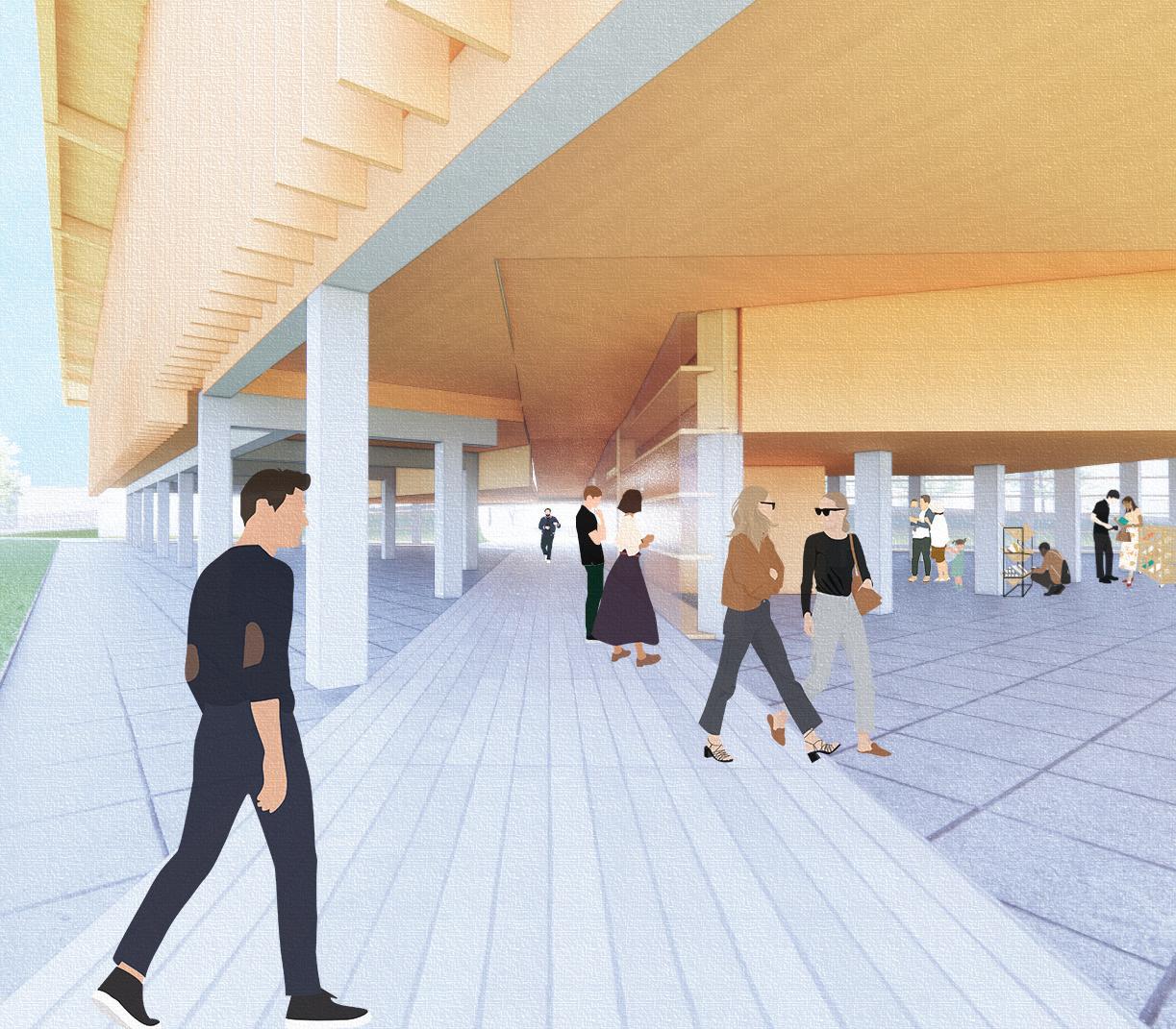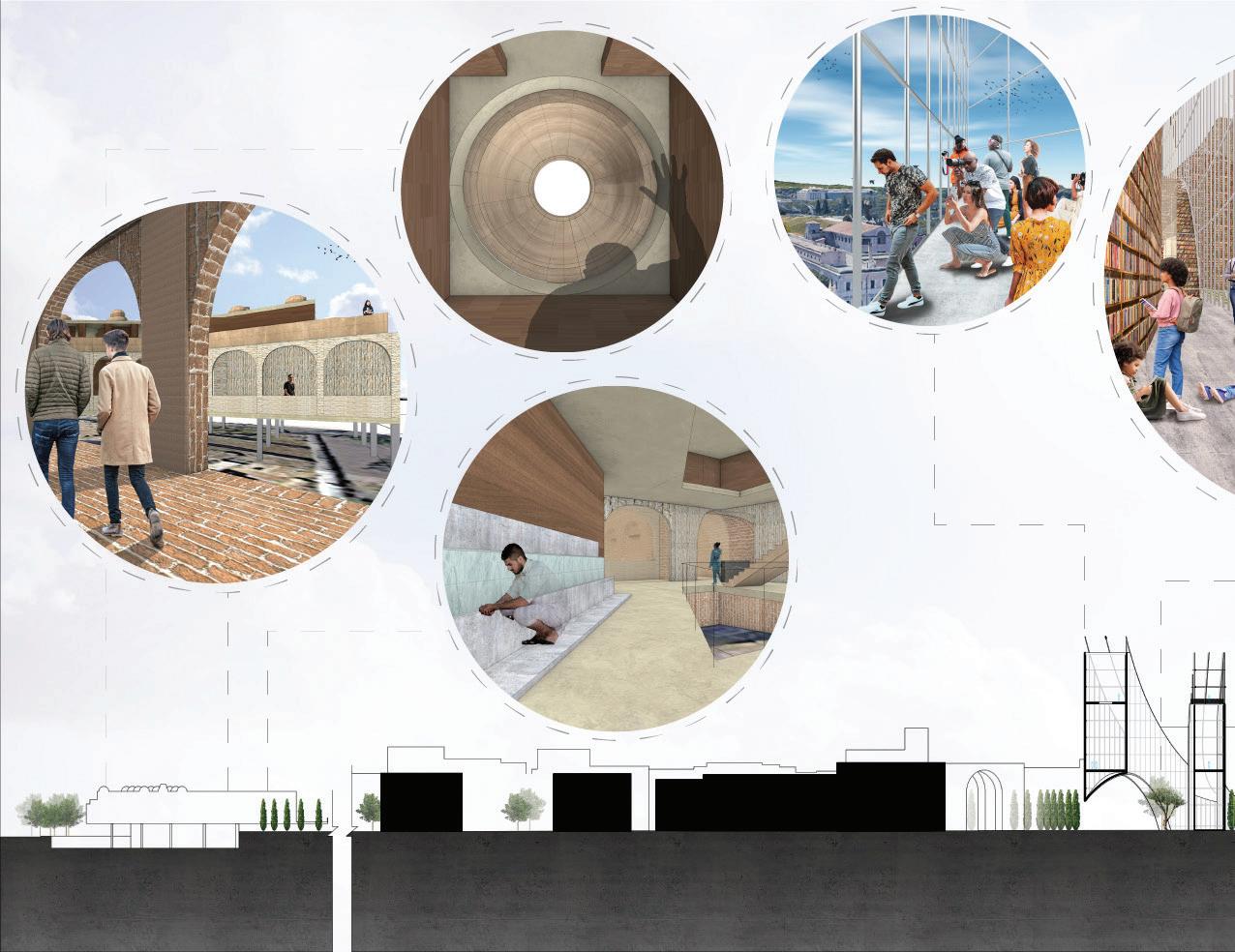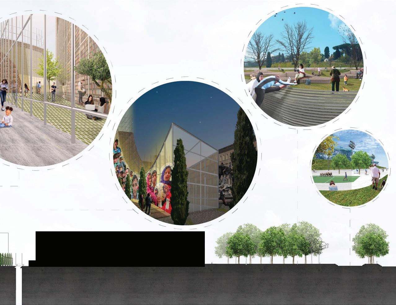A MEMORIAL TO COMMEMORATE LOST LIVES OF REFUGEES, ALLOW FOR GREATER INTEGRATION INTO ITALIAN SOCIETY AND SPACE AND BRING REFUGEES, RESIDENTS, AND VISITORS TOGETHER. LOCATED ON THE SITE OF THE ANCIENT FORUM BOARIUM WITH NUMEROUS ANCIENT, MEDIEVAL AND BAROQUE ARTIFACTS, THE SITE ITSELF IS CENTRAL TO THE HISTORY OF THE CITY. THE PROJECT AIMS TO TEACH PEOPLE ABOUT THE JOURNEY, HISTORY, AND COUNTRIES OF REFUGEES WITH INFORMATION SPREAD THROUGHOUT THE SITE. AT THE CENTER IS A LIBRARY, WHICH PROVIDES RESOURCES, REFUGE SURROUNDED BY BOOKS, AND AN OBSERVATION DECK OVERLOOKING THE CITY. CONNECTED TO THE LIBRARY TOWARDS THE NORTH IS THE MULTI-FAITH SPACE CENTER INTENDED TO BE A SPACE WHERE ANY RELIGION CAN BE PRACTICED AND EVENTS CAN BE HOSTED THERE. IN THE SOUTHEAST PART OF THE PROJECT ARE THE RECREATIONAL SPORTS FIELDS IN THE CIRCO MASSIMO.