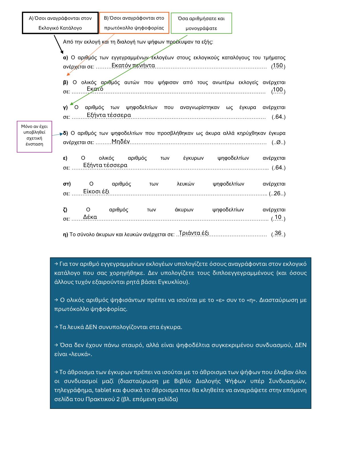 γιαόλουςτουςσυνδυασμούς(ΔΕΝ ΞΕΧΝΑΤΕ ΤΑ «ΣΥΝΟΛΑ ΜΗΔΕΝ») μετά μεταφέρετε τα αποτελέσματα που βγάλατε στο Πρακτικό 2 (και στο tablet και το τηλεγράφημα). Καλύτερο να προηγείται η μεταφορά στο tablet, διότι πιθανές αριθμητικές αναντιστοιχίες εντοπίζονται αυτόματα. Εμείς, πάντως, εξετάζουμε εν προκειμένω τη συμπλήρωση του Πρακτικού, το οποίο, σύμφωνα με το παράδειγμά μας, θα έχει ως εξής6: 6 Οι διατυπώσεις βασίζονται στο Πρακτικό 2 των Ευρωεκλογών 2019. Αντίστοιχες διατυπώσεις (ίσως λακωνικότερες) αναμένονται και φέτος.