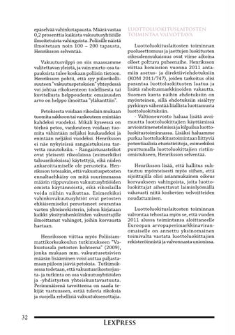 epäselvää vahinkotapausta. Määrä vastaa 0,2 prosenttia kaikista vakuutusyhtiöille ilmoitetuista vahingoista. Poliisille näistä ilmoitetaan noin 100 – 200 tapausta, Henriksson selventää. Vakuutusvilppi on siis maassamme valitettavan yleistä, ja vain murto-osa tapauksista tulee koskaan poliisin tietoon. Henriksson pohtii, että syy piilorikollisuuteen ”vakuutuspetoksien” yhteydessä voi johtua rikoksenteon todellisesta tai kuvitellusta helppoudesta: omaisuuden arvo on helppo ilmoittaa ”yläkanttiin”. Petoksesta voidaan rikoslain mukaan tuomita sakkoon tai vankeuteen enintään kahdeksi vuodeksi. Mikäli kyseessä on törkeä petos, vankeuteen voidaan tuomita vähintään neljäksi kuukaudeksi ja enintään neljäksi vuodeksi. Henriksson ei näe nykyisissä rangaistuksissa tarvetta muutoksiin. - Rangaistusasteikot ovat yleisesti rikoslaissa (esimerkiksi talousrikoksissa) käytettyjä, eikä niiden ankaroittamiselle ole perusteita. Henriksson toteaakin, että vakuutuspetosten ennaltaehkäisy on mitä suurimmassa määrin riippuvainen vakuutusyhtiöiden omista käytännöistä, eikä rikoslailla voida niihin vaikuttaa. Esimerkiksi vahinkovakuutusyhtiöt ovat petosten ehkäisemiseksi perustaneet seurantaa varten yhteisrekisterin, johon kirjataan kaikki yksityishenkilöiden vakuuttajille ilmoittamat vahingot, joihin korvausta haetaan. Henriksson viittaa myös Poliisiammattikorkeakoulun tutkimukseen ”Vakuutusala petosten kohteena” (2009), jonka mukaan mm. vakuutusetsivien määrän lisääminen voisi auttaa paljastamaan piiloon jääviä petoksia. Tutkimuksessa todetaan, että vakuutusrikostorjunta- ja tutkinta on osa vakuutusyhtiöiden ja -yhdistysten yhteiskuntavastuuta. Perimmäisenä tavoitteena on saada tekijät vastuuseen, estää tulevia rikoksia ja suojella rehellisiä vakuutuksenottajia.