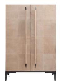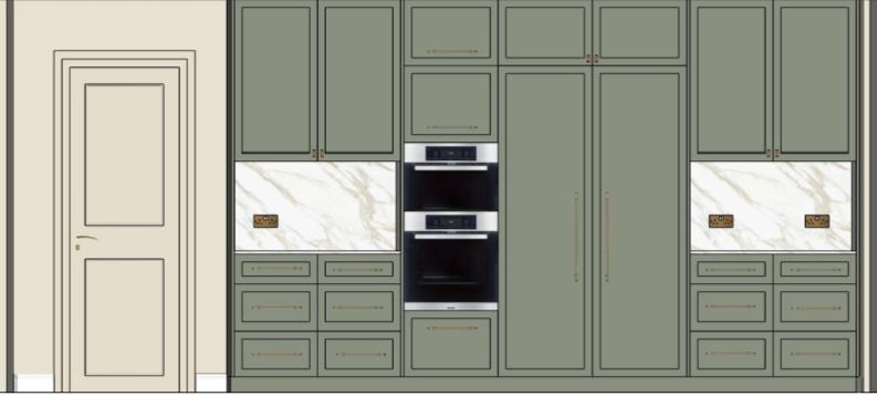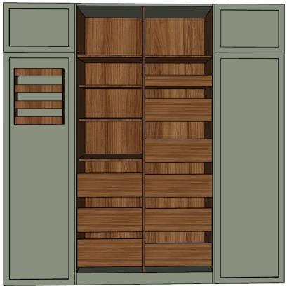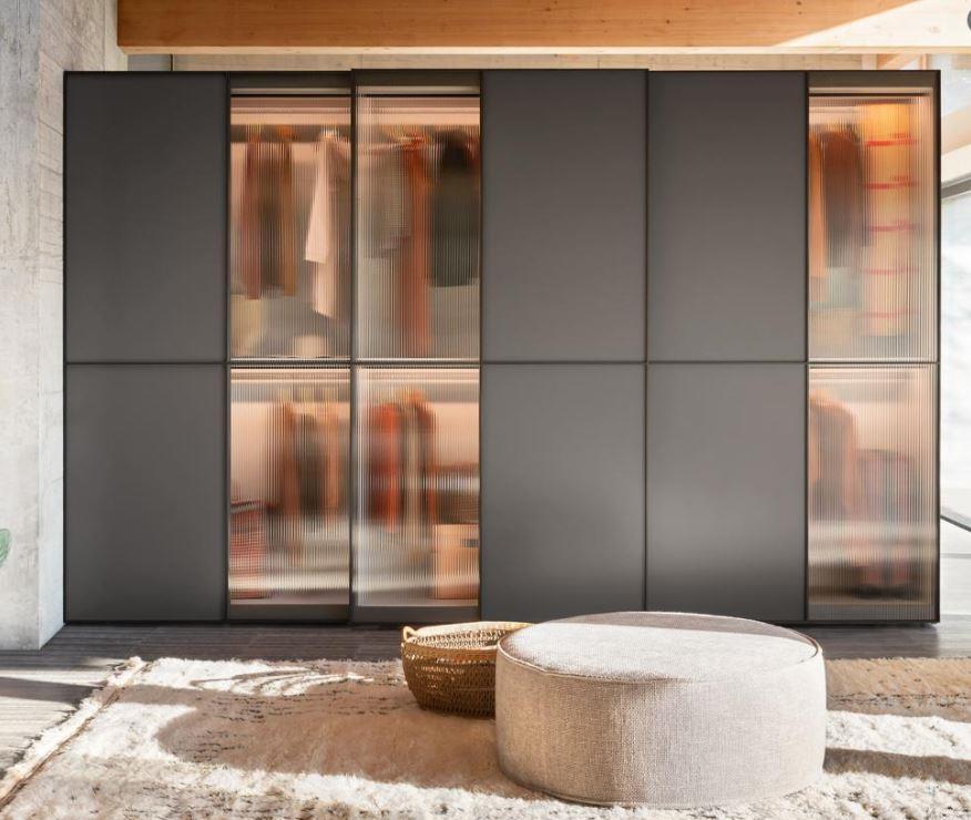 Materials for sliding doors: MDF with wood veneer finish and framed with brass. Glass doors: shaded and embossed glass, framed in brass