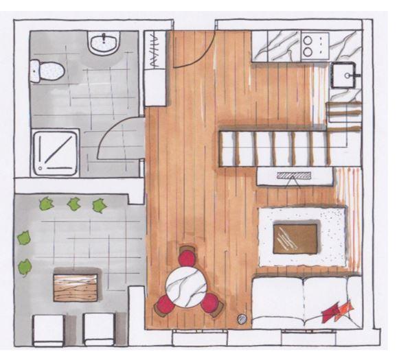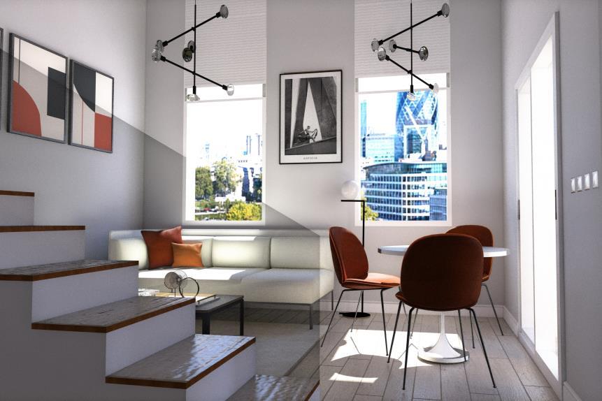 Her main requirements are to keep an openspace, light and contemporary, where she can relax after a working day and sharing good time with friends At the same time, she wants some private zone for a bedroom