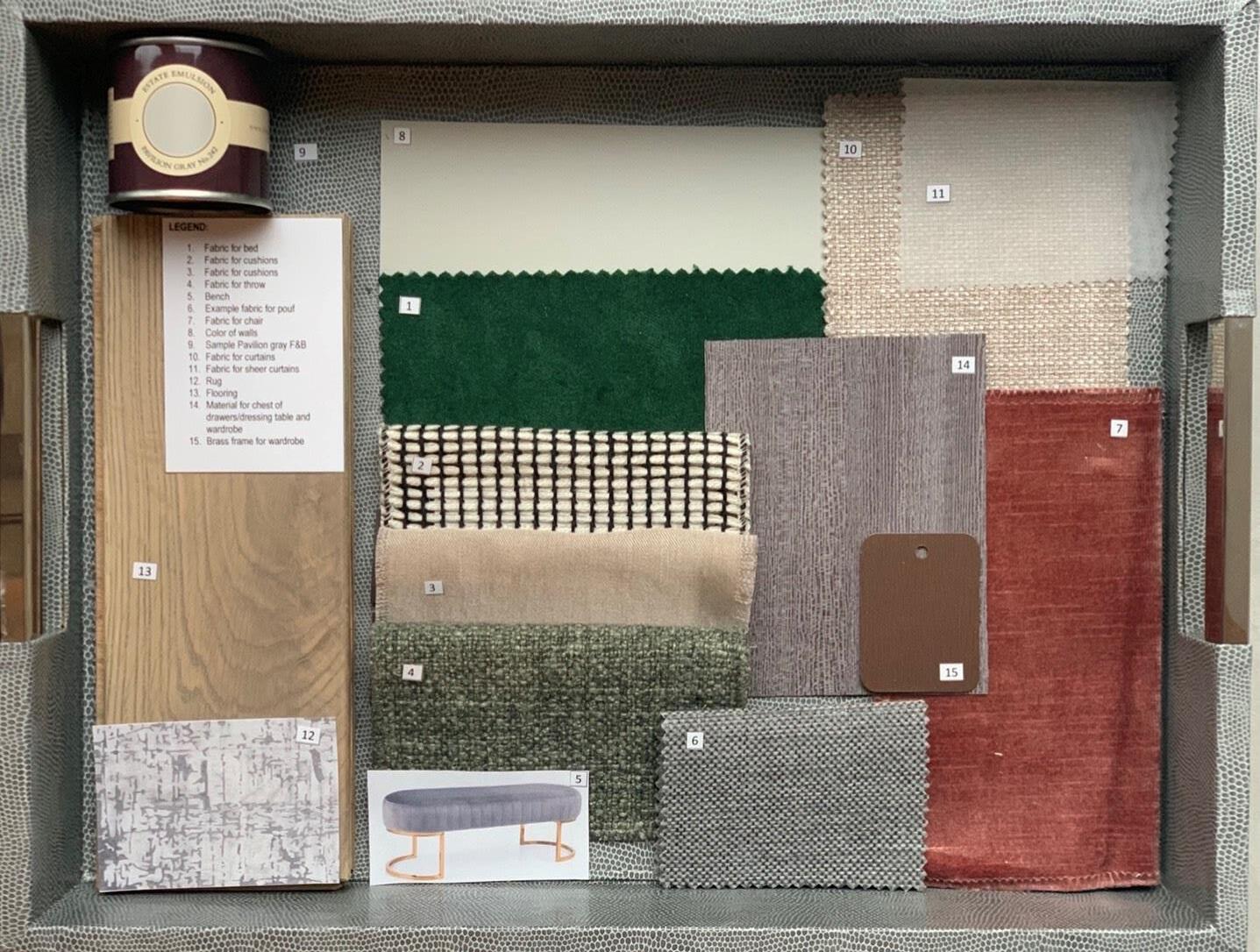 2. Fabric for cushions 3. Fabric for cushions 4. Fabric for throw 5. Bench