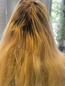 This has happened to me when a client forgot to mention pre-existing color. The roots lifted beautifully but the ends, well, not so well. In this case I suggest a root smudge. I like using 8.021/8NVA Mocha or 6.021/6NVA Macchiato blended into an end toner that is applied on level for a seamless transition.