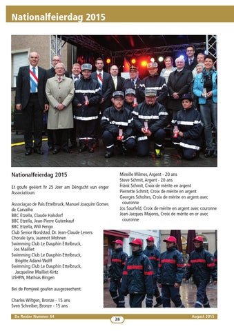 Nationalfeierdag 2015 Et goufe geéiert fir 25 Joer am Déngscht vun enger Associatioun: Associaçao de Pais Ettelbruck, Manuel Joaquim Gomes de Carvalho BBC Etzella, Claude Halsdorf BBC Etzella, Jean-Pierre Gutenkauf BBC Etzella, Will Ferigo Club Senior Nordstad, Dr. Jean-Claude Leners Chorale Lyra, Jeannot Mohnen Swimming Club Le Dauphin Ettelbruck, Jos Mailliet Swimming Club Le Dauphin Ettelbruck, Brigitte Adami-Wolff Swimming Club Le Dauphin Ettelbruck, Jacqueline Mailliet-Kirtz USHPN, Mathias Bingen