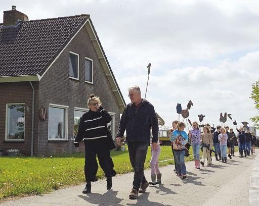 Het was een feest voor de kinderen van de basisschool uit Wjelsryp. Ze werden opgehaald met een trekker en huifkarren. Op de boerderij stond een verrassing klaar: een groot gat in het weiland, waar ze in mochten kijken. Foppe Boersma vertelde ze alles over de grond in Wjelsryp. Hoe diep zat de klei eigenlijk? Daarna gingen ze aan de slag met kunstenaar Hilda Klaassen. Op tafels vol verf en klei uit het weiland beschilderden ze maskers met de spannendste bodemdieren. Er verschenen duizendpoten, fantasiebeesten en kronkelende wormen. Alles mocht. Iedereen werkte met aandacht en plezier. Een paar weken later was er een kunstparade in het dorp. De maskers hingen mooi tentoongesteld in het dorpshuis. Ouders, grootouders, broertjes en zusjes kwamen kijken. Er werd nagepraat en gelachen, terwijl lange tafels werden gevuld met eten. Een mooie afsluiting van een creatieve reis door de klei van Wjelsryp. En een herinnering die hopelijk nog lang blijft hangen.