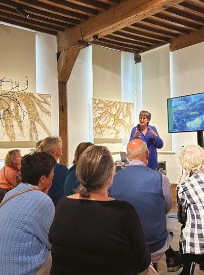 In de sfeervolle expositiezaal, omringd door de werken van Grûntoanen, luisterden zo’n 25 bezoekers ademloos naar Doet Boersma. Ze sprak met warmte en helderheid over haar jarenlange reis met het thema grond; van bladeren afdrukken op doek tot het proces van fotosynthese. Vol met haar persoonlijke verhalen gaf ze kleur aan het kijken. Je voelde hoe haar schilderijen groeiden uit de grond. Een lezing als een wandeling door de prachtige schilderijen van Doet.