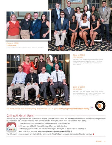 Calling All Gmail Users! With Gmail’s new organizational tabs for their email program, your LFA Alumni e-news and the LFA Parent e-news are automatically being filtered to your Promotions tab. There are three easy ways to move us to the Primary tab, where you’ll see our emails more readily. 1. Drag and drop the LFA e-news from the Promotions tab to the Primary tab. 2. PC users can right-click the email to move it from one tab to the other. 3. Messages you mark with a star will also move to your Primary tab so they’re easier to keep track of. Learn more about tabs here: https://support.google.com/mail/answer/3055016 The LFA Alumni e-news is usually sent the first Friday of the month. The LFA Parent e-news is distributed on Thursday mornings. n