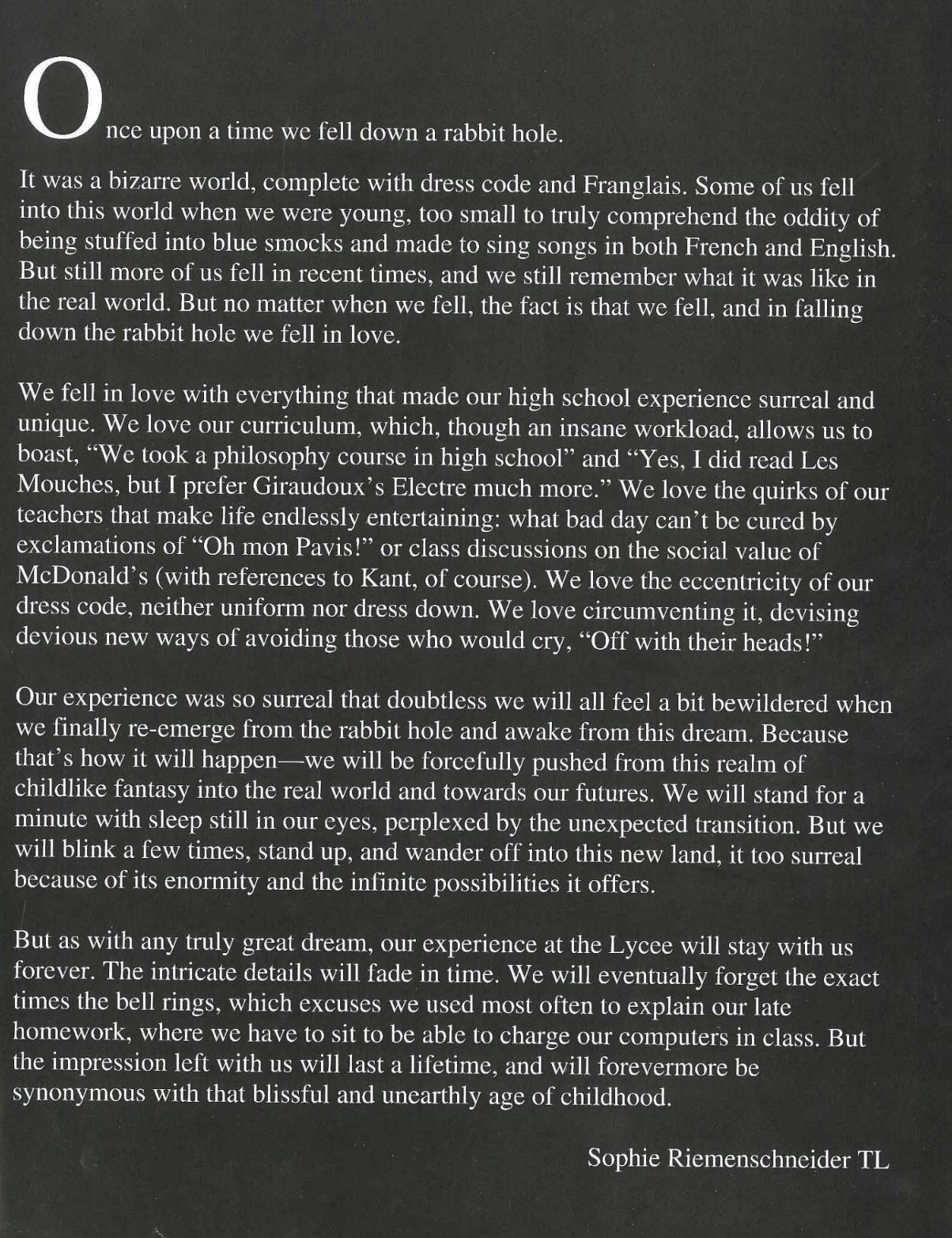 The Lycée counts seven alumni among its current faculty and staff: Nadine Kaston ‘80, Joëlle Reilly ‘80, Clarissa Sylvestre ‘99, Chris Haspil ‘01, Bienvenu Etsike ‘05, Sophie Riemenschneider ‘09, Fabrice Ulysse ‘16. Sophie wrote this essay to her classmates to close out the 2009 yearbook: