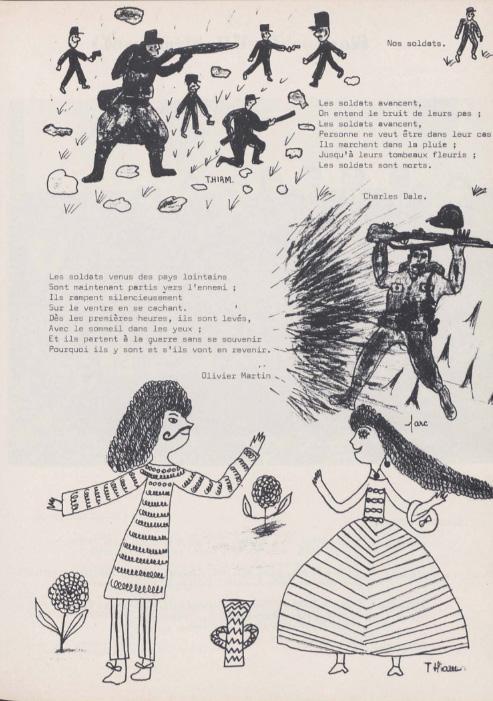 The rise of youth voices echoed at the Lycée in the late 1960s: the yearbook became a snapshot of the era, showcasing art and poetry that reflected student concerns and preoccupations–from war to generational differences to fashion.