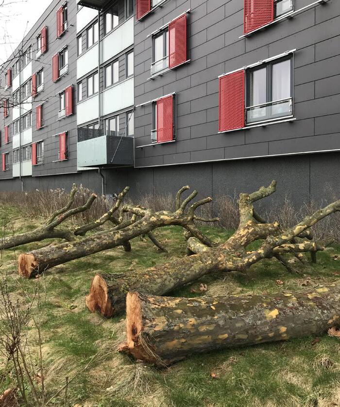 skåret til og ligger nu og venter på at blive genbrugt på et senere tidspunkt i projektet. Planen er, at de bliver lagt i den grønne grøft, der laves mellem blok 4 og parkeringspladsen ved Peder Lykkes Vej. Træstammerne vil skabe bedre forhold for biodiversitet for planter og insekter.