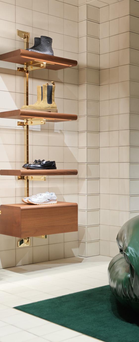 MIDDLE LEFT Bottega Veneta’s striking interior features luxurious green marble alongside custom tiled walls and curved wood millwork that creates dynamic movement throughout the space.