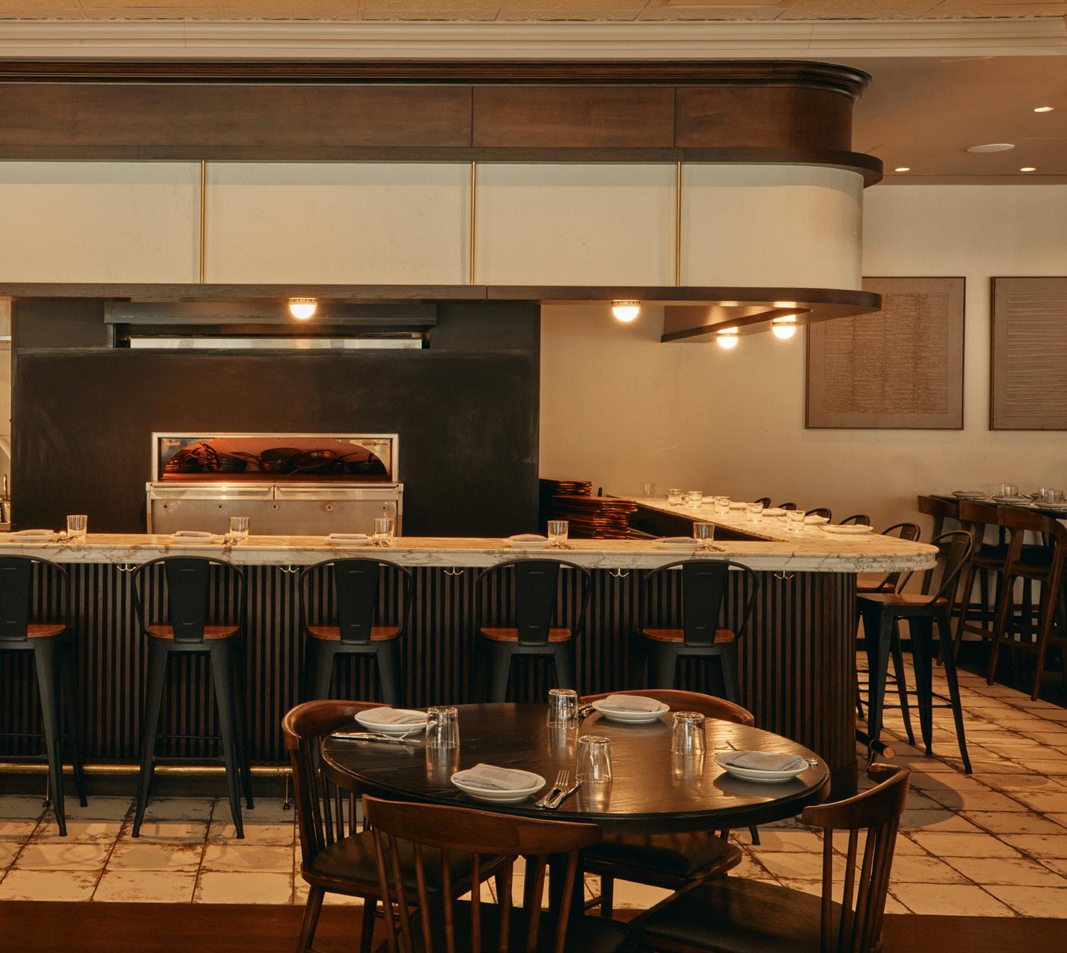 TOP LEFT Il Carciofo’s cozy bar showcases warm lighting anchored by a custom fixture, complemented by rich dark wood millwork and elegant brass screening details.