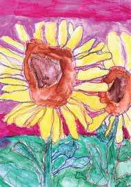 Second graders created these colorful crayon-resist sunflowers using the continuous line drawing method, contour lines, and watercolor painting techniques such as “washing” and “charging” colors.
