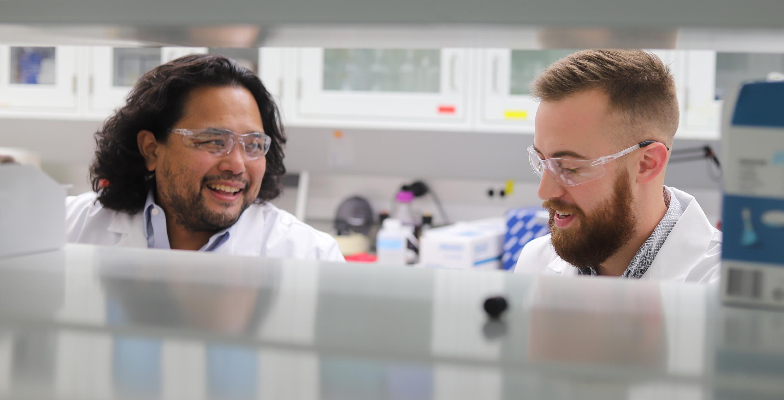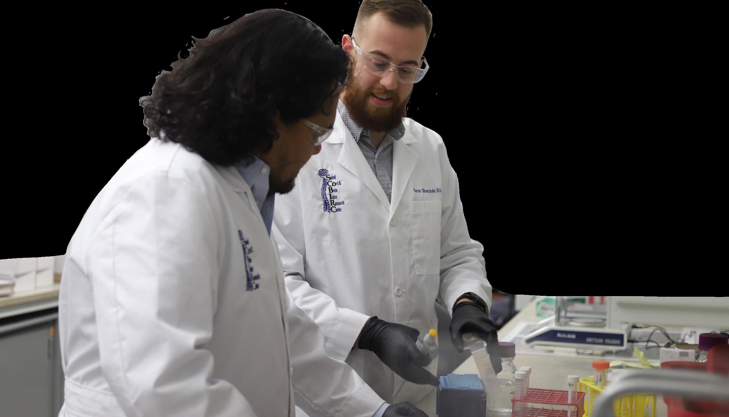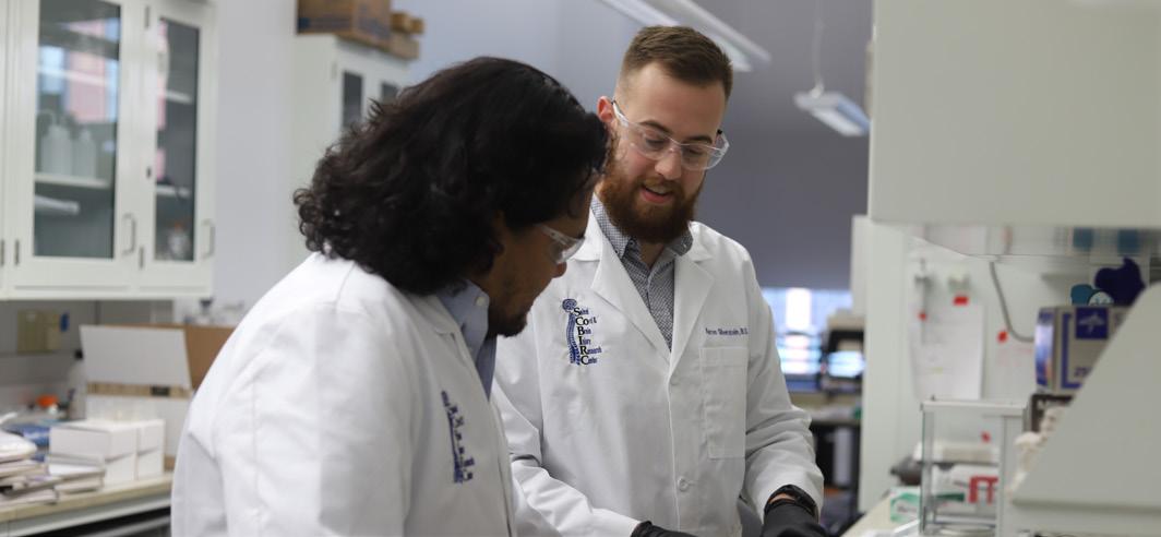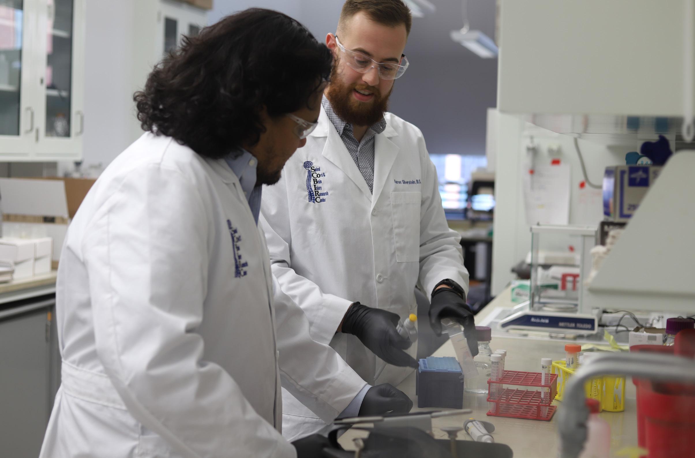 Warren Alilain, PhD, associate professor of neuroscience (left), mentors MD/PhD student Aaron Silverstein in his lab that studies spinal cord injury. MD/PhD students gain experience in research laboratories along with medical training.