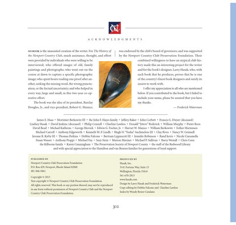 was endorsed by the club’s board of governors; and was supported by the Newport Country Club Preservation Foundation. Their combined willingness to have an atypical club history made this an interesting project for the writer and for the book’s designer, Larry Hasak, who, with each book that he produces, proves that he is one of the country’s finest book designers and surely its easiest to work with. I offer my appreciation to all who are mentioned below. If you contributed to the book, but I failed to include your name, please be assured that you have my thanks. — Frederick Waterman