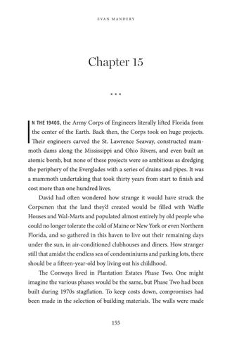 moth dams along the Mississippi and Ohio Rivers, and even built an atomic bomb, but none of these projects were so ambitious as dredging the periphery of the Everglades with a series of drains and pipes. It was a mammoth undertaking that took thirty years from start to finish and cost more than one hundred lives. David had often wondered how strange it would have struck the Corpsmen that the land they’d created would be filled with Waffle Houses and Wal-Marts and populated almost entirely by old people who could no longer tolerate the cold of Maine or New York or even Northern Florida, and so gathered in this haven to live out their remaining days under the sun, in air-conditioned clubhouses and diners. How stranger still that amidst the endless sea of condominiums and parking lots, there should be a fifteen-year-old boy living out his childhood. The Conways lived in Plantation Estates Phase Two. One might imagine the various phases would be the same, but Phase Two had been built during 1970s stagflation. To keep costs down, compromises had been made in the selection of building materials. The walls were made 155