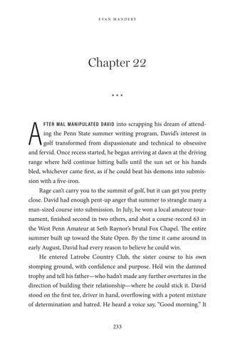and fervid. Once recess started, he began arriving at dawn at the driving range where he’d continue hitting balls until the sun set or his hands bled, whichever came first, as if he could beat his demons into submission with a five-iron. Rage can’t carry you to the summit of golf, but it can get you pretty close. David had enough pent-up anger that summer to strangle many a man-sized course into submission. In July, he won a local amateur tournament, finished second in two others, and shot a course-record 63 in the West Penn Amateur at Seth Raynor’s brutal Fox Chapel. The entire summer built up toward the State Open. By the time it came around in early August, David had every reason to believe he could win. He entered Latrobe Country Club, the sister course to his own stomping ground, with confidence and purpose. He’d win the damned trophy and tell his father—who hadn’t made any further overtures in the direction of building their relationship—where he could stick it. David stood on the first tee, driver in hand, overflowing with a potent mixture of determination and hatred. He heard a voice say, “Good morning.” It 233