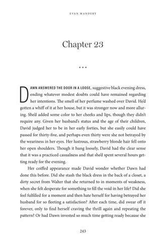 gotten a whiff of it at her house, but it was stronger now and more alluring. She’d added some color to her cheeks and lips, though they didn’t require any. Given her husband’s status and the age of their children, David judged her to be in her early forties, but she easily could have passed for thirty-five, and perhaps even thirty were she not betrayed by the weariness in her eyes. Her lustrous, strawberry blonde hair fell onto her open shoulders. Though it hung loosely, David had the clear sense that it was a practiced casualness and that she’d spent several hours getting ready for the evening. Her coiffed appearance made David wonder whether Dawn had done this before. Did she stash the black dress in the back of a closet, a dirty secret from Walter that she returned to in moments of weakness, when she felt desperate for something to fill the void in her life? Did she feel fulfilled for a moment and then hate herself for having betrayed her husband for so fleeting a satisfaction? After each time, did swear off it forever, only to find herself craving the thrill again and repeating the pattern? Or had Dawn invested so much time getting ready because she 243